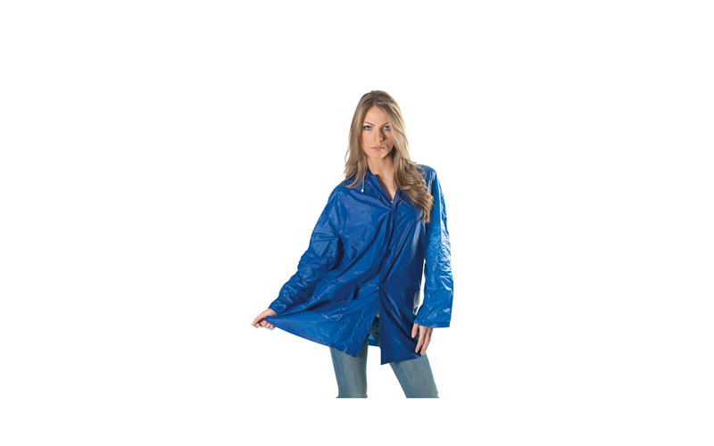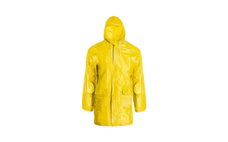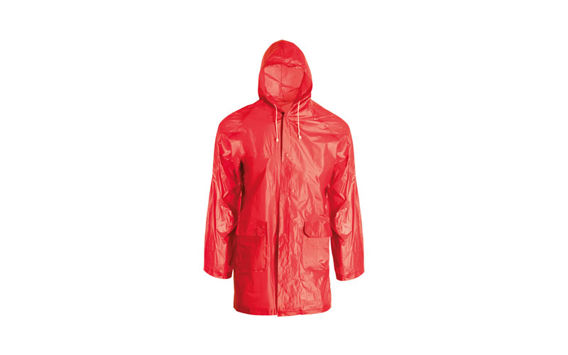 Impermeabile goffrato in pvc (spessore mm 0.12 ca), pouch, cappuccio cm 35 ca, 2 tasche laterali, bottoni a pressione