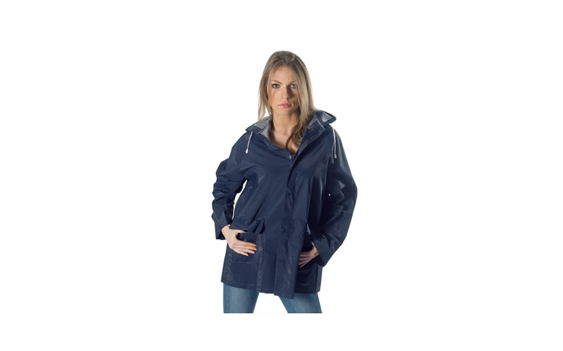 Giacca antipioggia in pvc goffrato, fodera interna retinata, spessore pvc mm 0.30 ca, chiusura con zip, bottoni a pressione, 2 tasche, cappuccio mm 38 ca