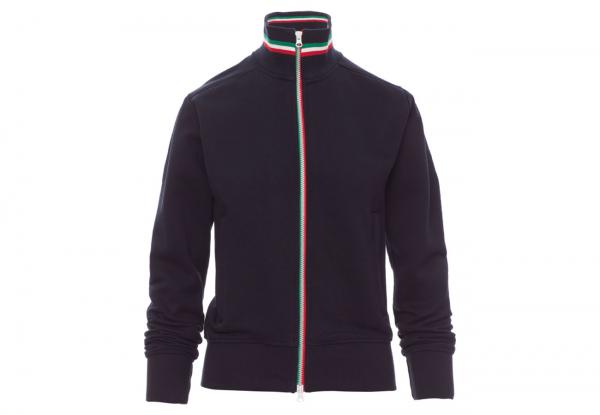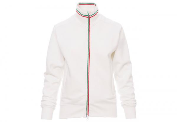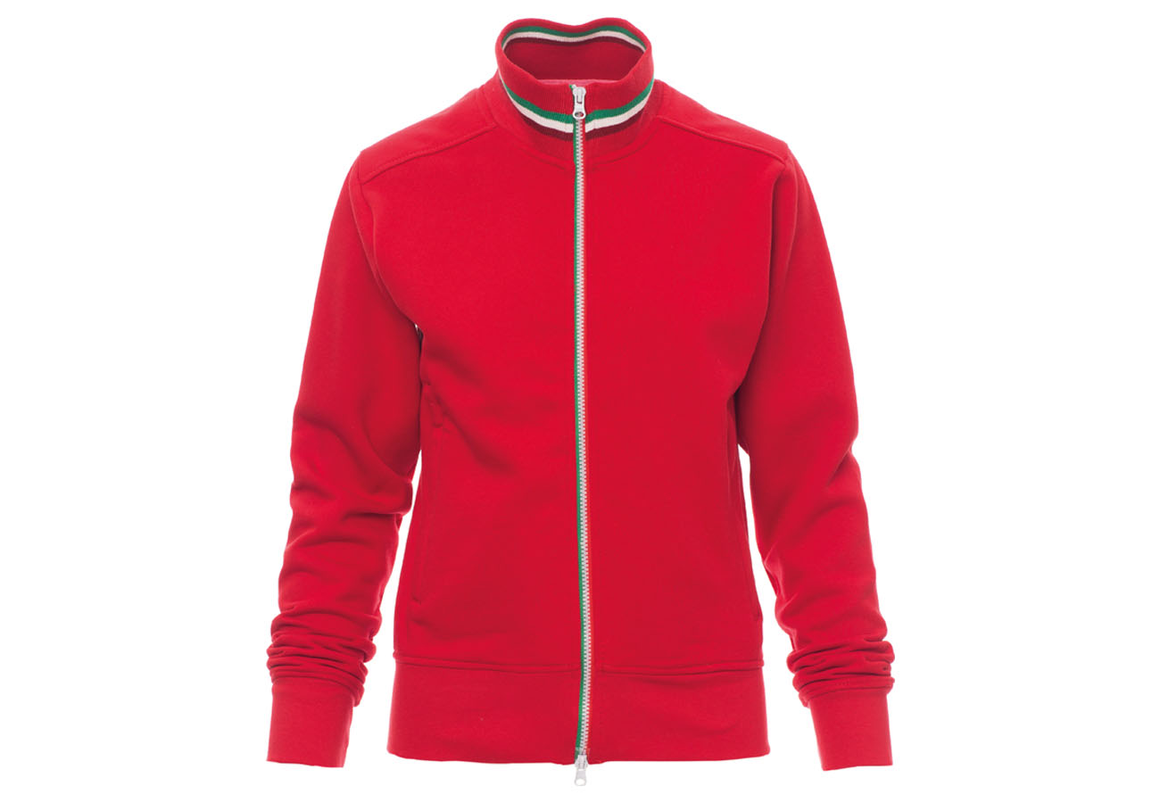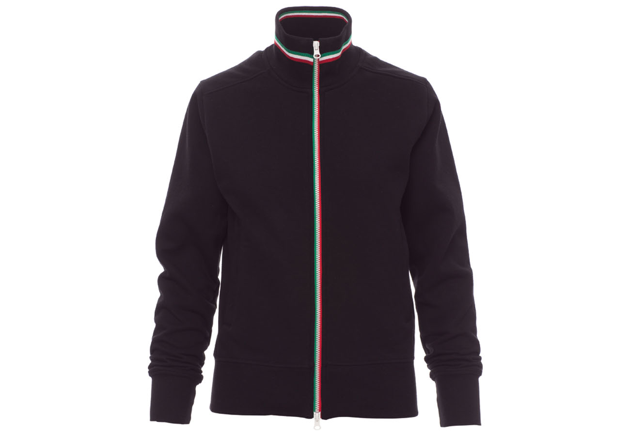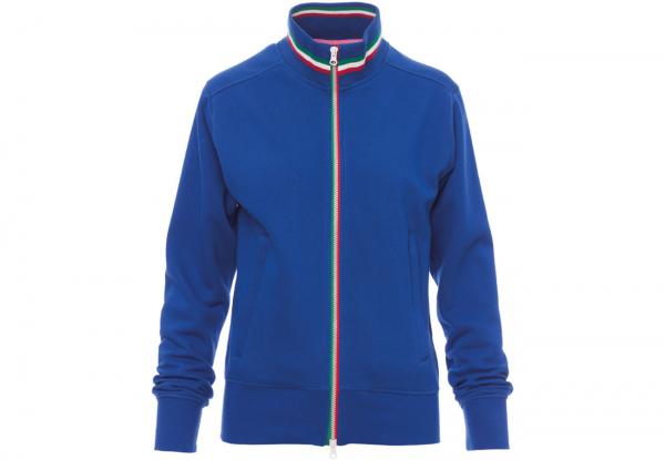 Felpa sfiancata da donna, zip intera SBS in plastica con tricolore a contrasto con doppio cursore in metallo, colletto in rib cont ricolore a contrasto, manica a giro, due tasche esterne, polsini e vita in costina elasticizzata, cuciture rinforzate.