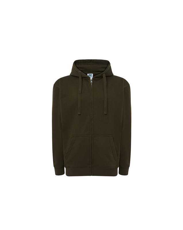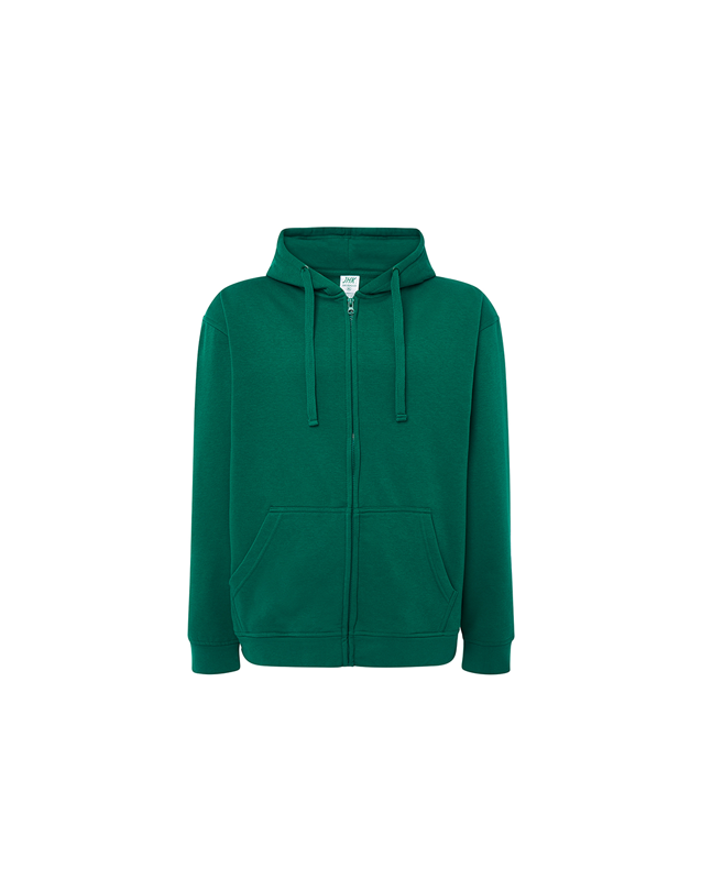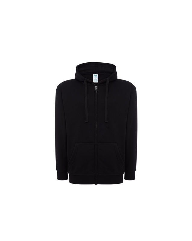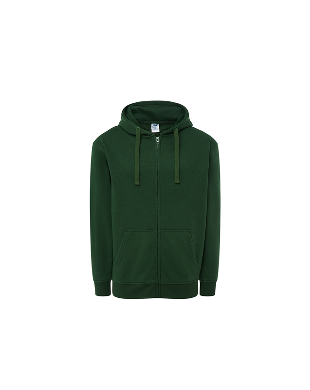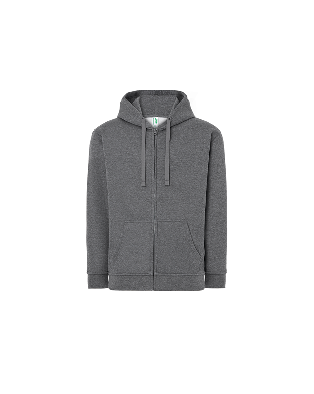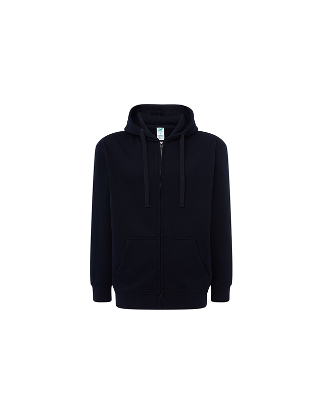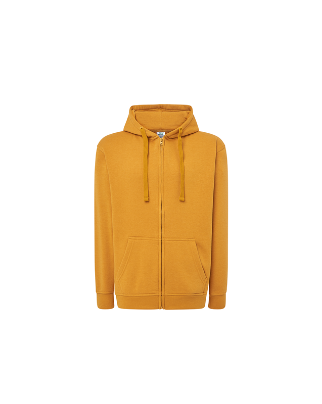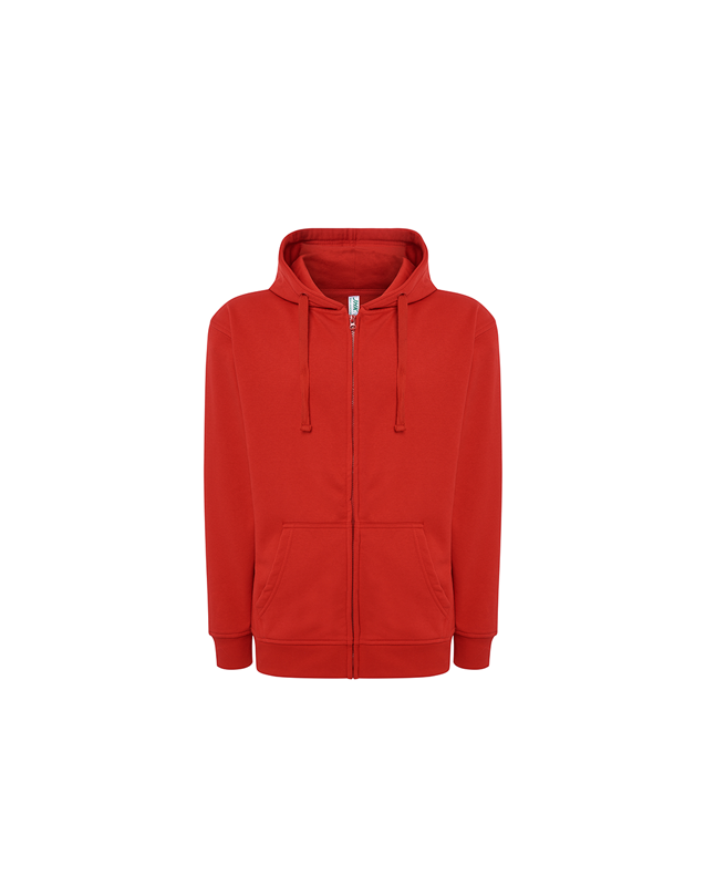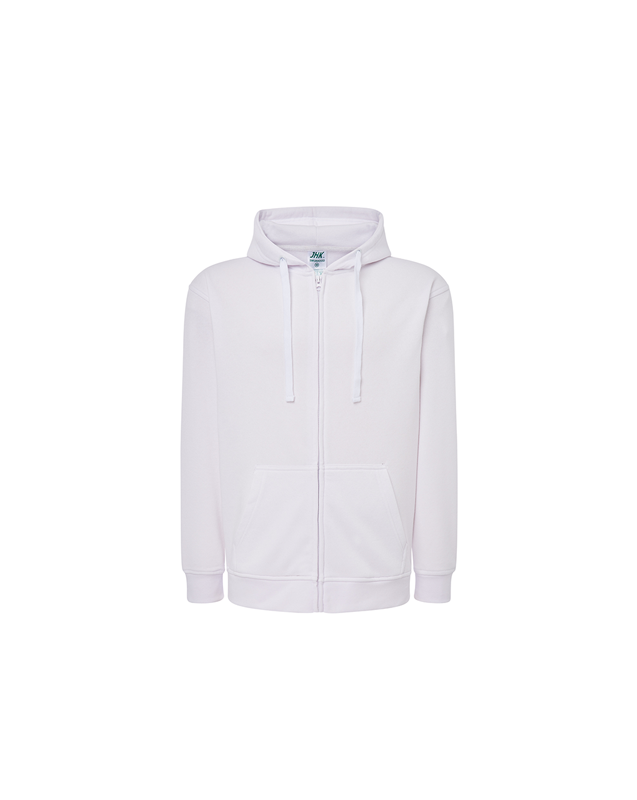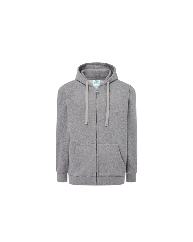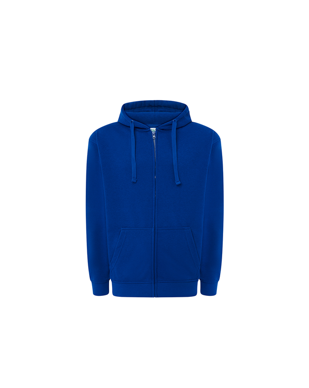 Felpa con cappuccio e zip intera, cordino del cappuccio in tinta, tasche a marsupio, costina 1x1 in lycra su polsini e girovita.
