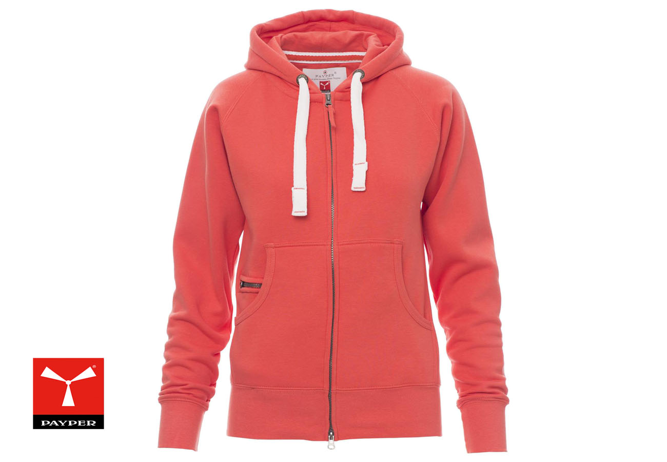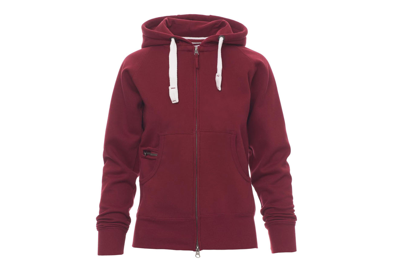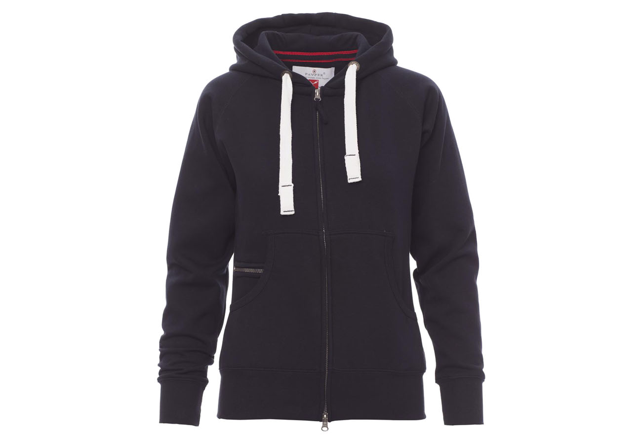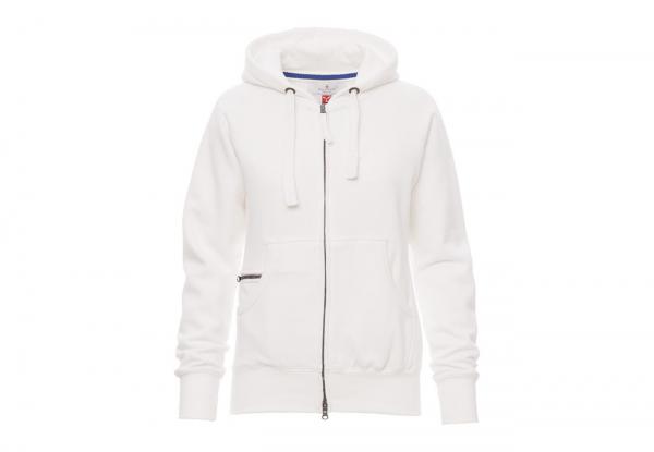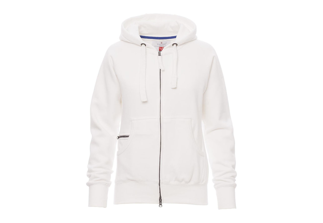 Felpa sfiancata da donna, zip intera SBS coperta, in plastica con doppio cursore in metallo, cappuccio con due cuciture, coulisse bianca in corda con cuciture in tinta con la felpa e anelle in metallo, manica raglan, tasche a marsupio con taschino zip, polsini e vita in costina elasticizzata. Cuciture rinforzate.