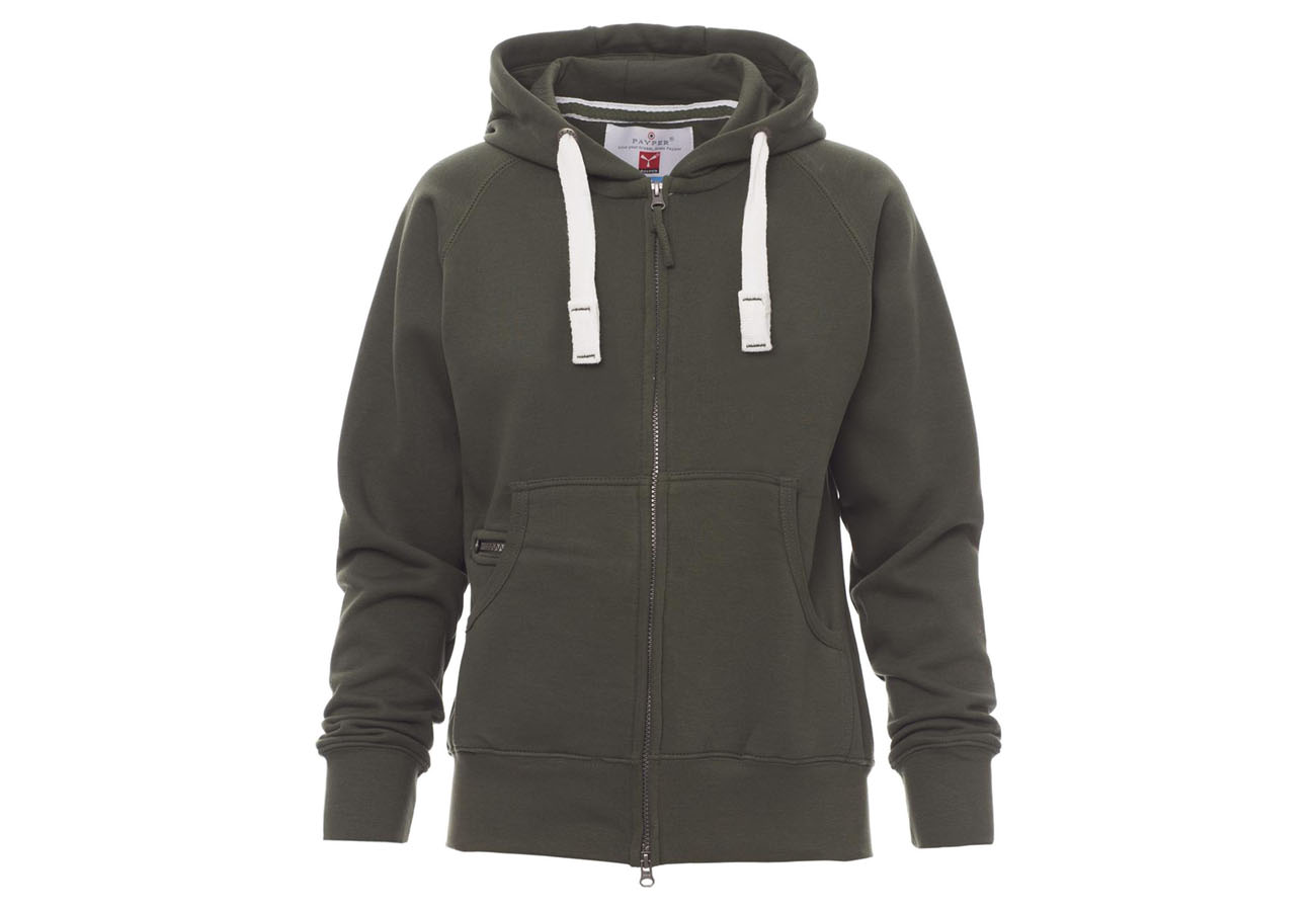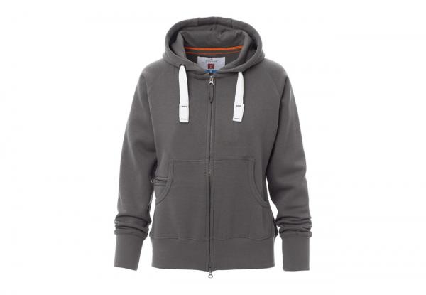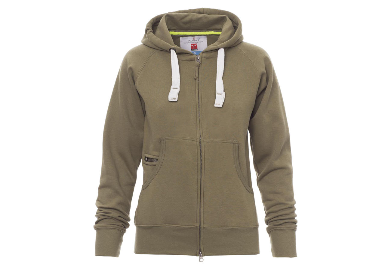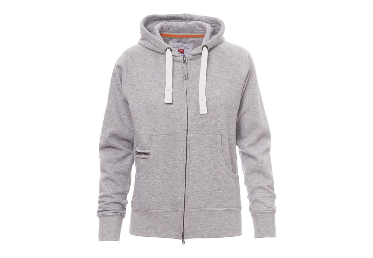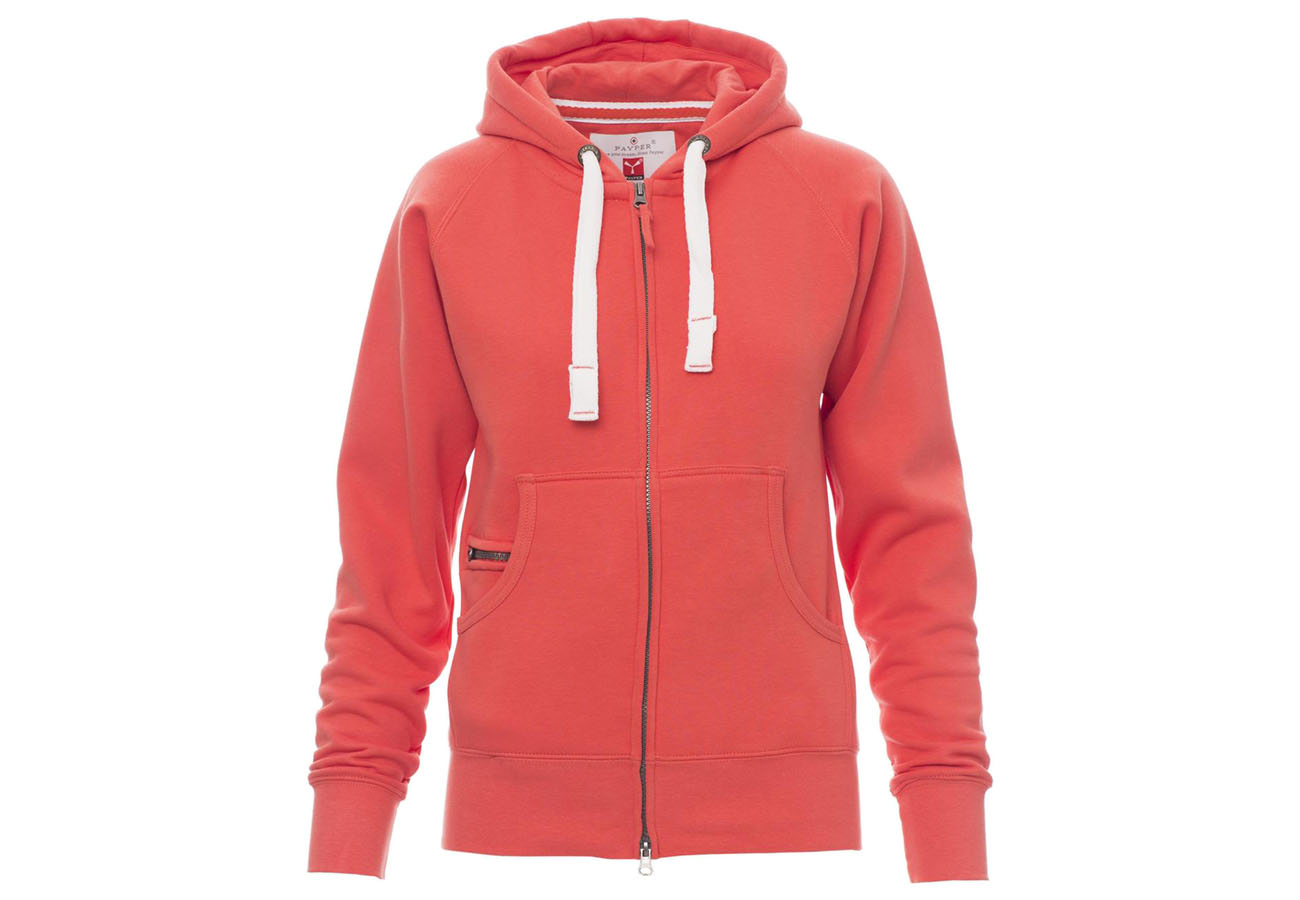 Felpa sfiancata da donna, zip intera SBS coperta, in plastica con doppio cursore in metallo, cappuccio con due cuciture, coulisse bianca in corda con cuciture in tinta con la felpa e anelle in metallo, manica raglan, tasche a marsupio con taschino zip, polsini e vita in costina elasticizzata. Cuciture rinforzate.