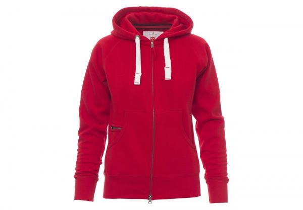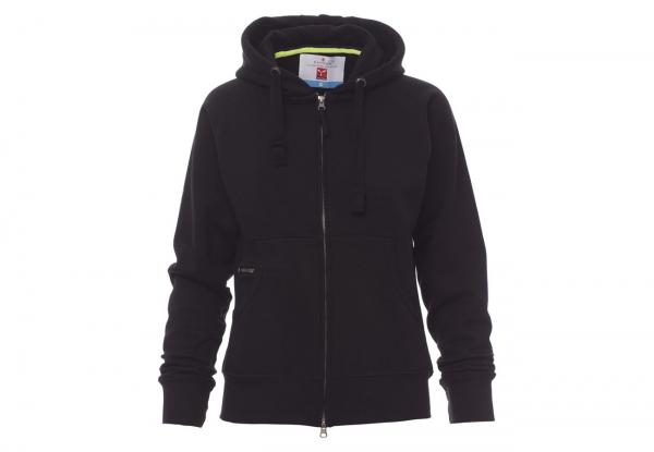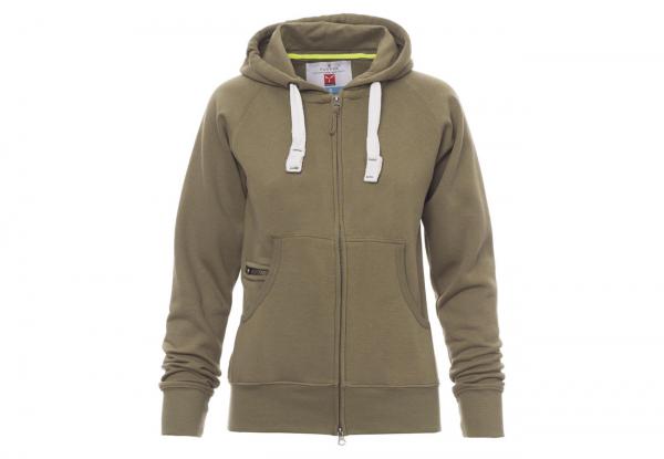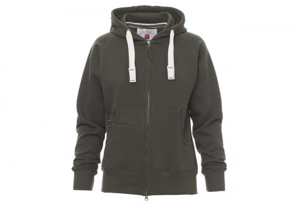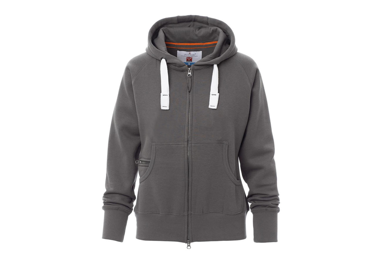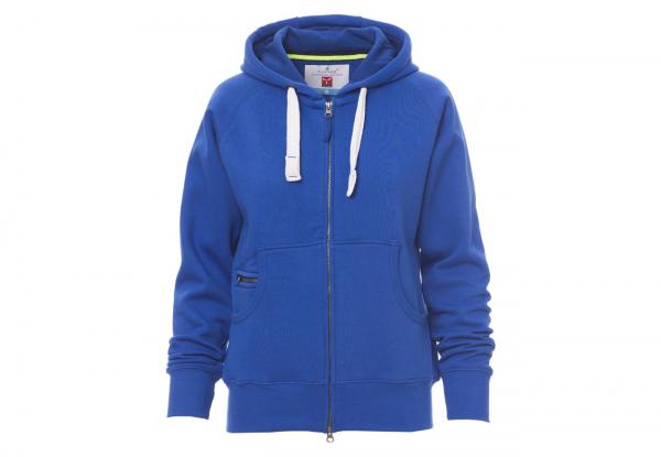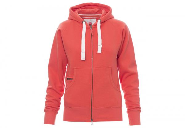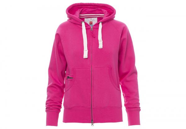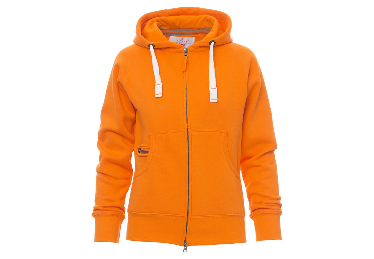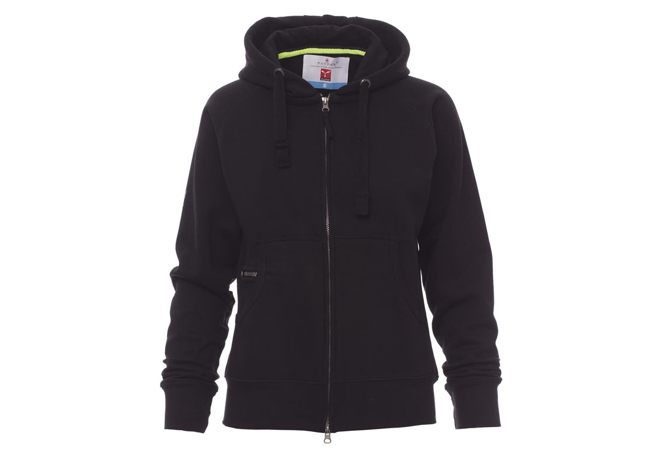 Felpa sfiancata da donna, zip intera SBS coperta, in plastica con doppio cursore in metallo, cappuccio con due cuciture, coulisse bianca in corda con cuciture in tinta con la felpa e anelle in metallo, manica raglan, tasche a marsupio con taschino zip, polsini e vita in costina elasticizzata. Cuciture rinforzate.