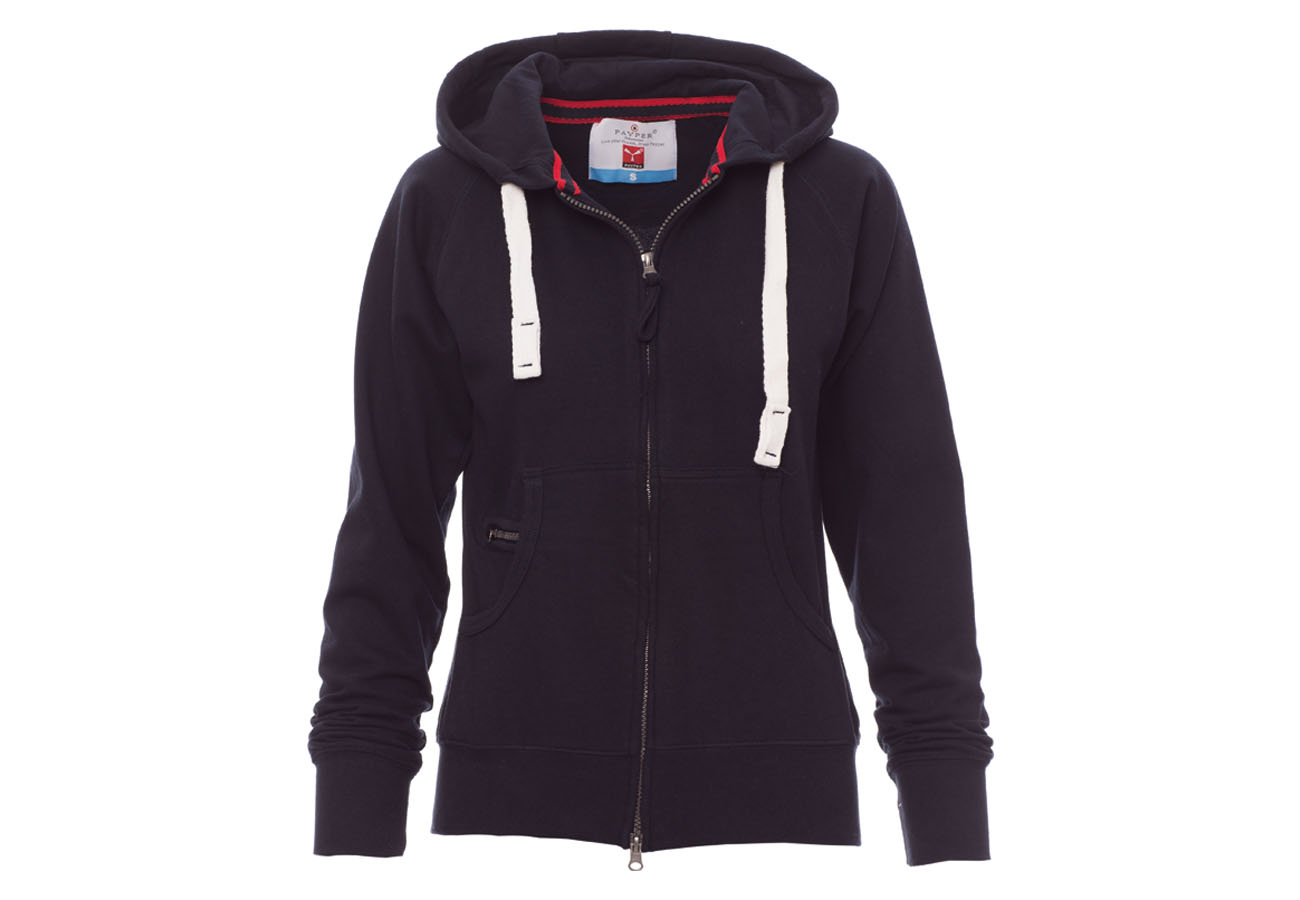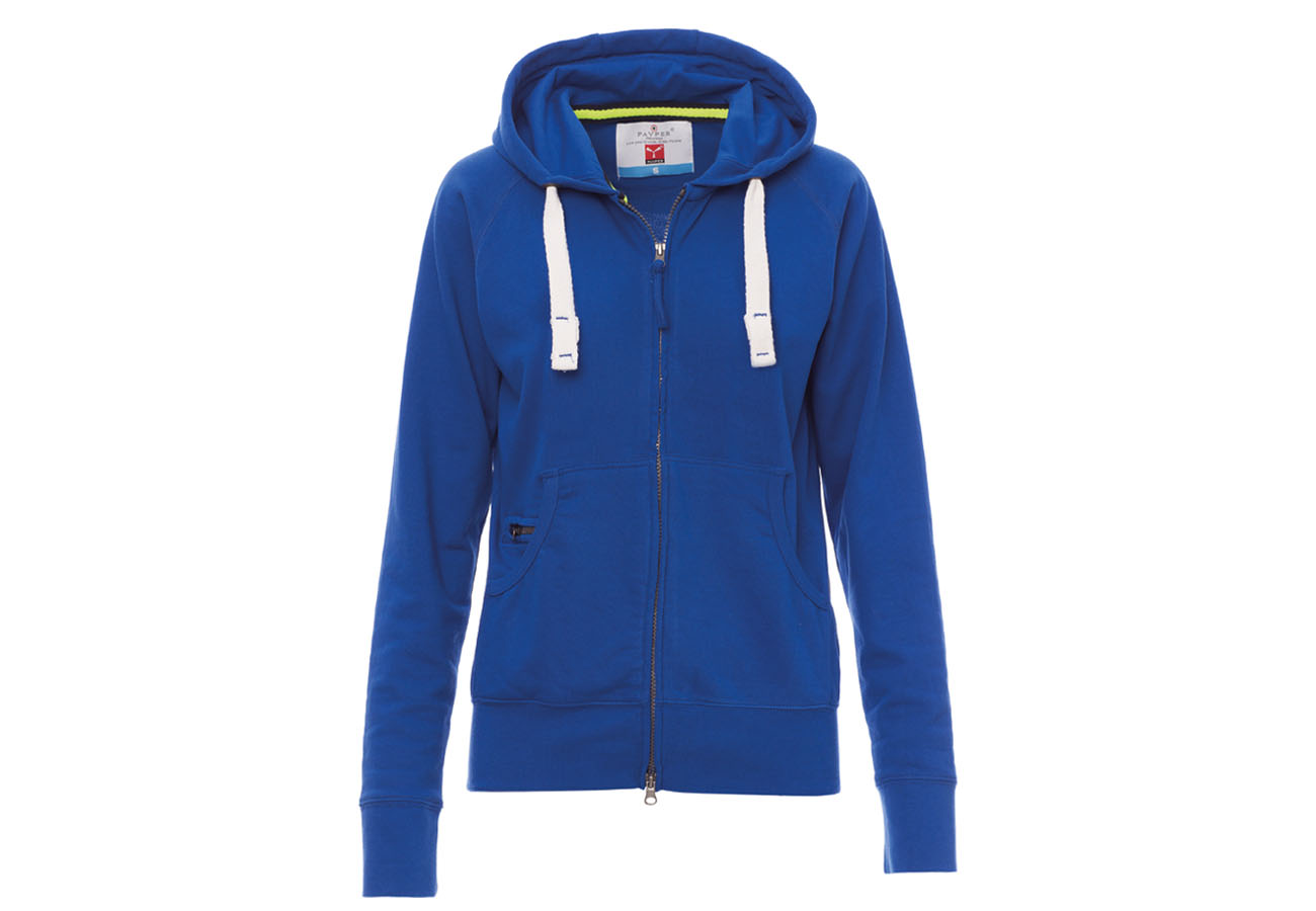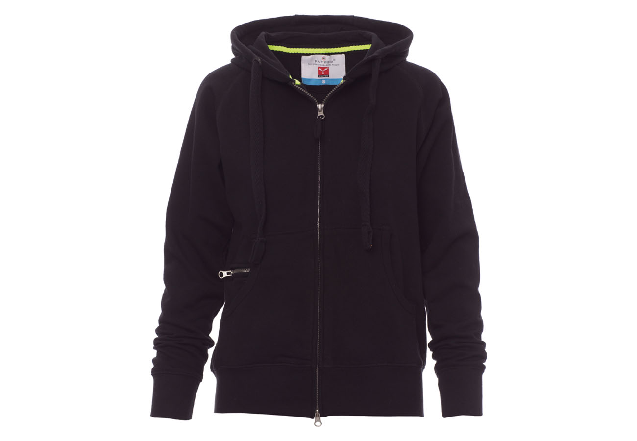 Felpa sfiancata da donna, zip intera SBS coperta con doppio cursore in metallo, cappuccio con due cuciture, coulisse bianca con cuciture in tinta con la felpa e anelle in metallo, manica raglan, tasche a marsupio con taschino zip, polsini e vita in costina elasticizzata. Cuciture rinforzate.