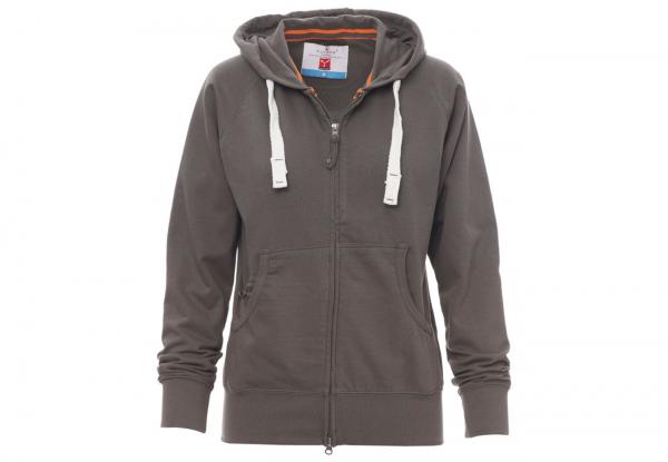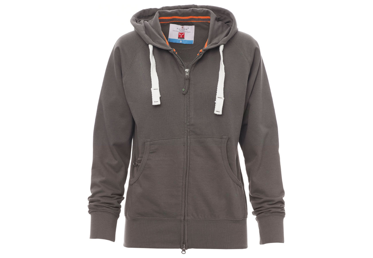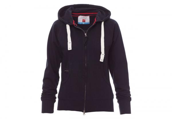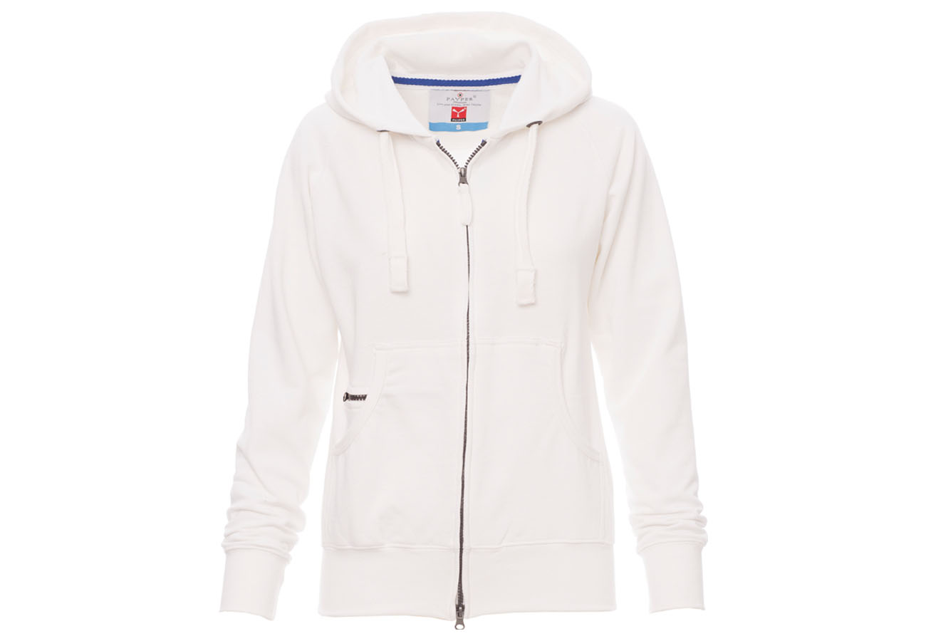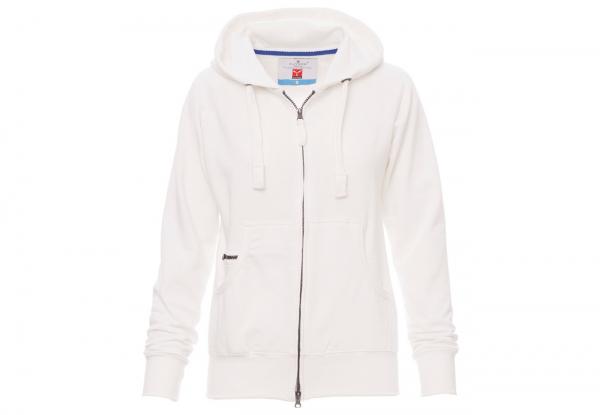 Felpa sfiancata da donna, zip intera SBS coperta con doppio cursore in metallo, cappuccio con due cuciture, coulisse bianca con cuciture in tinta con la felpa e anelle in metallo, manica raglan, tasche a marsupio con taschino zip, polsini e vita in costina elasticizzata. Cuciture rinforzate.