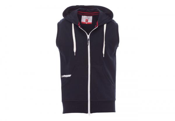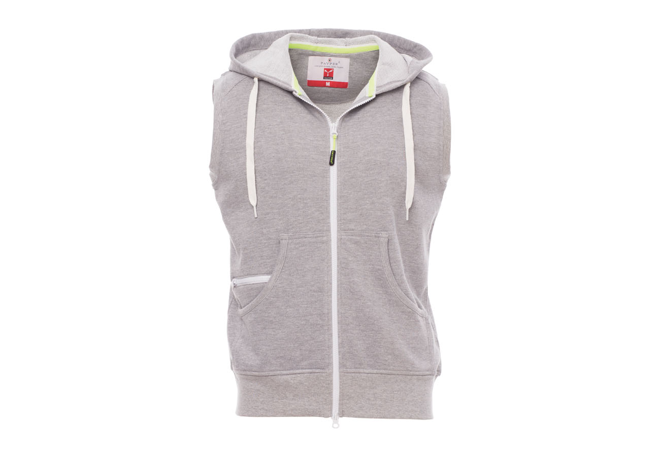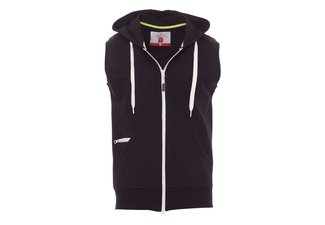 Felpa senza maniche da uomo, zip intera in plastica in colore a contrasto, con doppio cursore in metallo, cappuccio sagomato e coulisse a contrasto, tasche a marsupio con taschino con zip