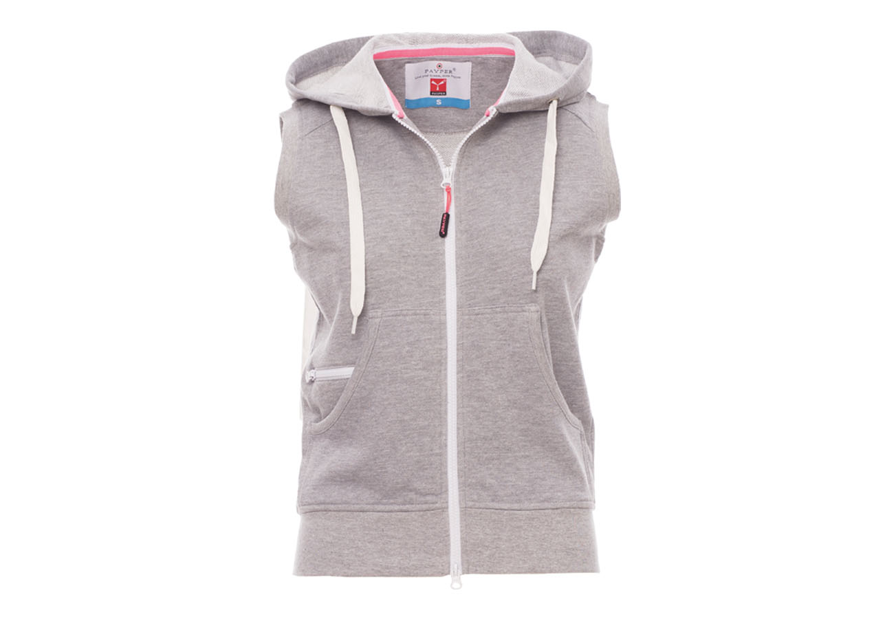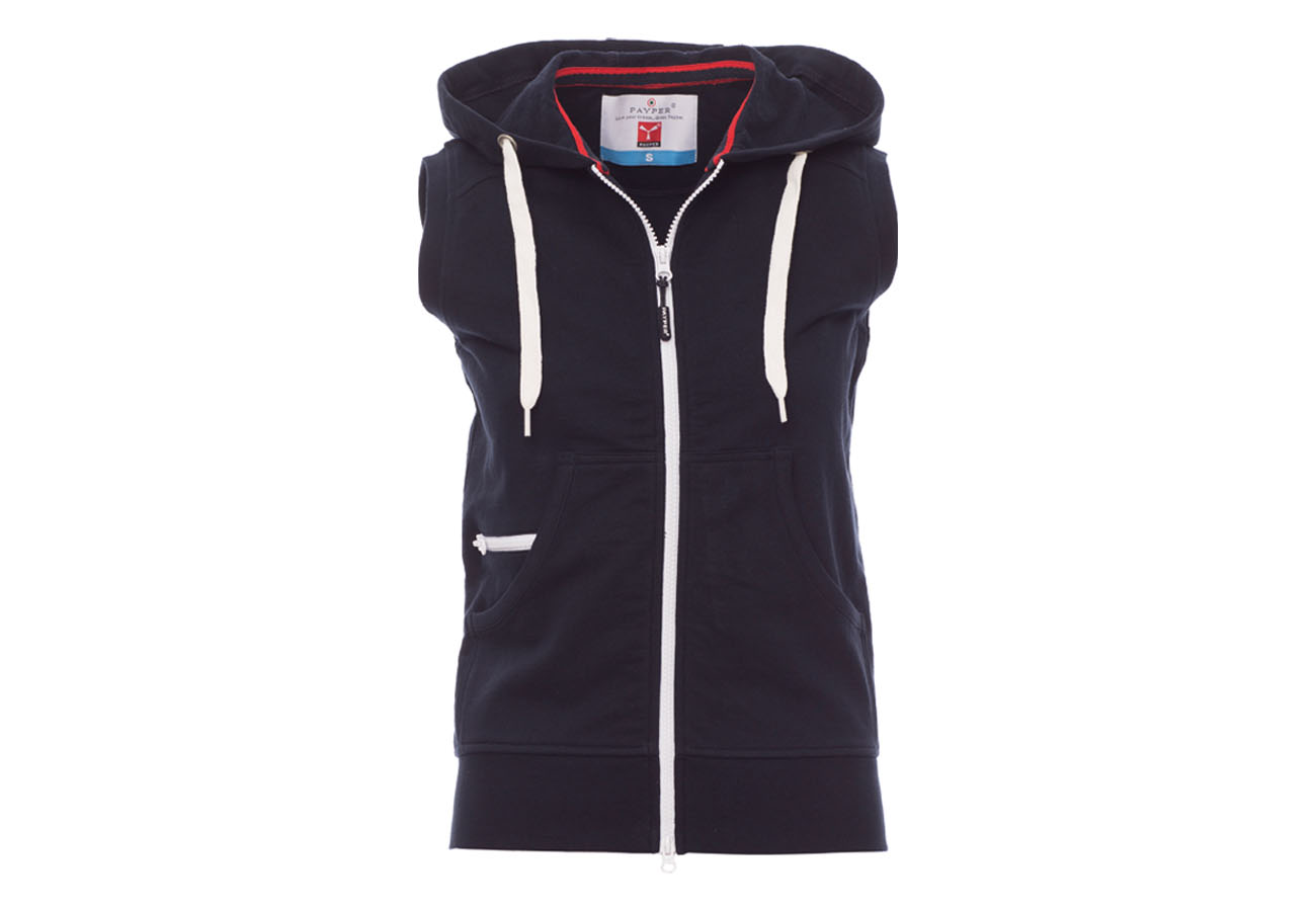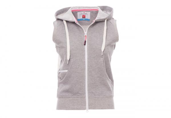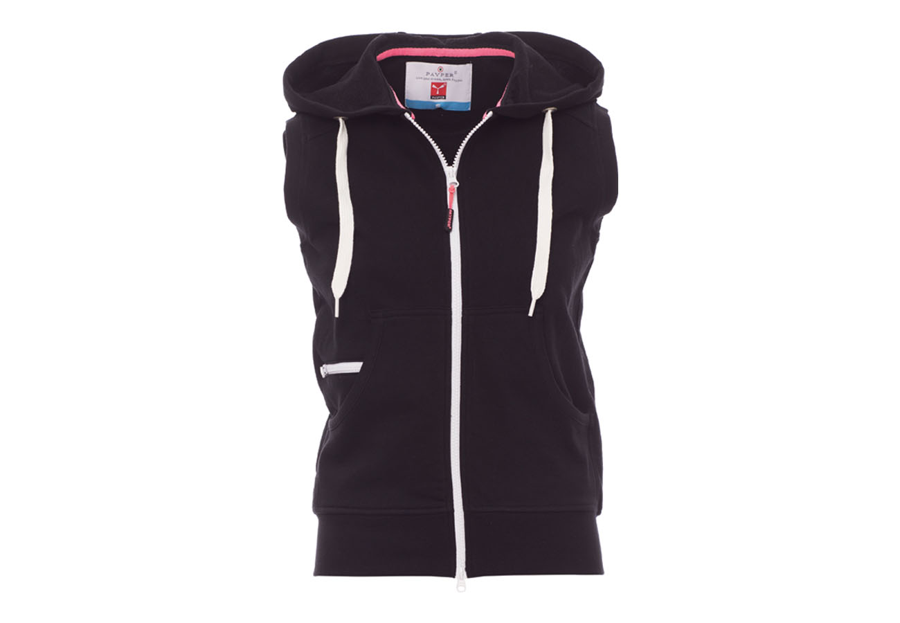 Felpa senza maniche da donna, zip intera in plastica in colore a contrasto, con doppio cursore in metallo, cappuccio sagomato e coulisse a contrasto, tasche a marsupio con taschino con zip