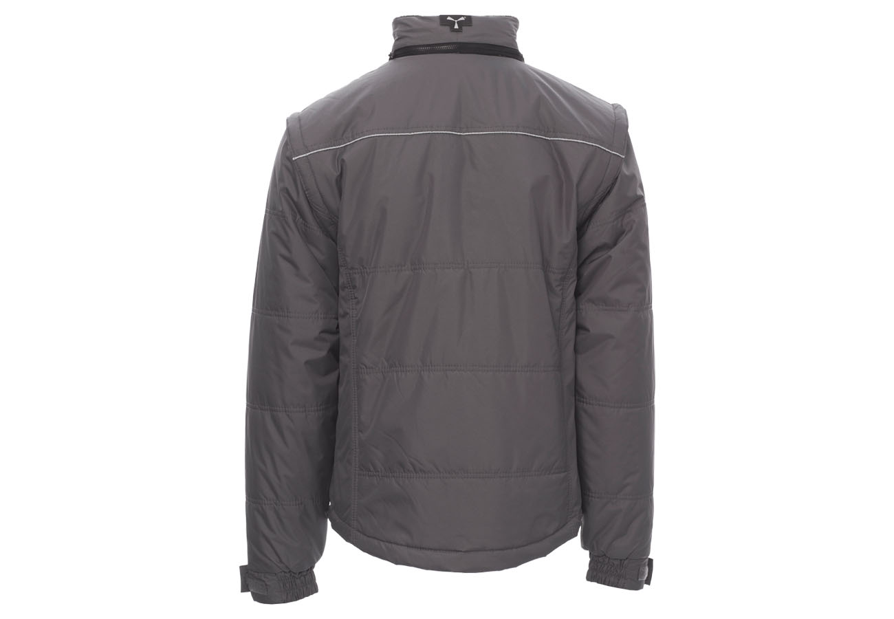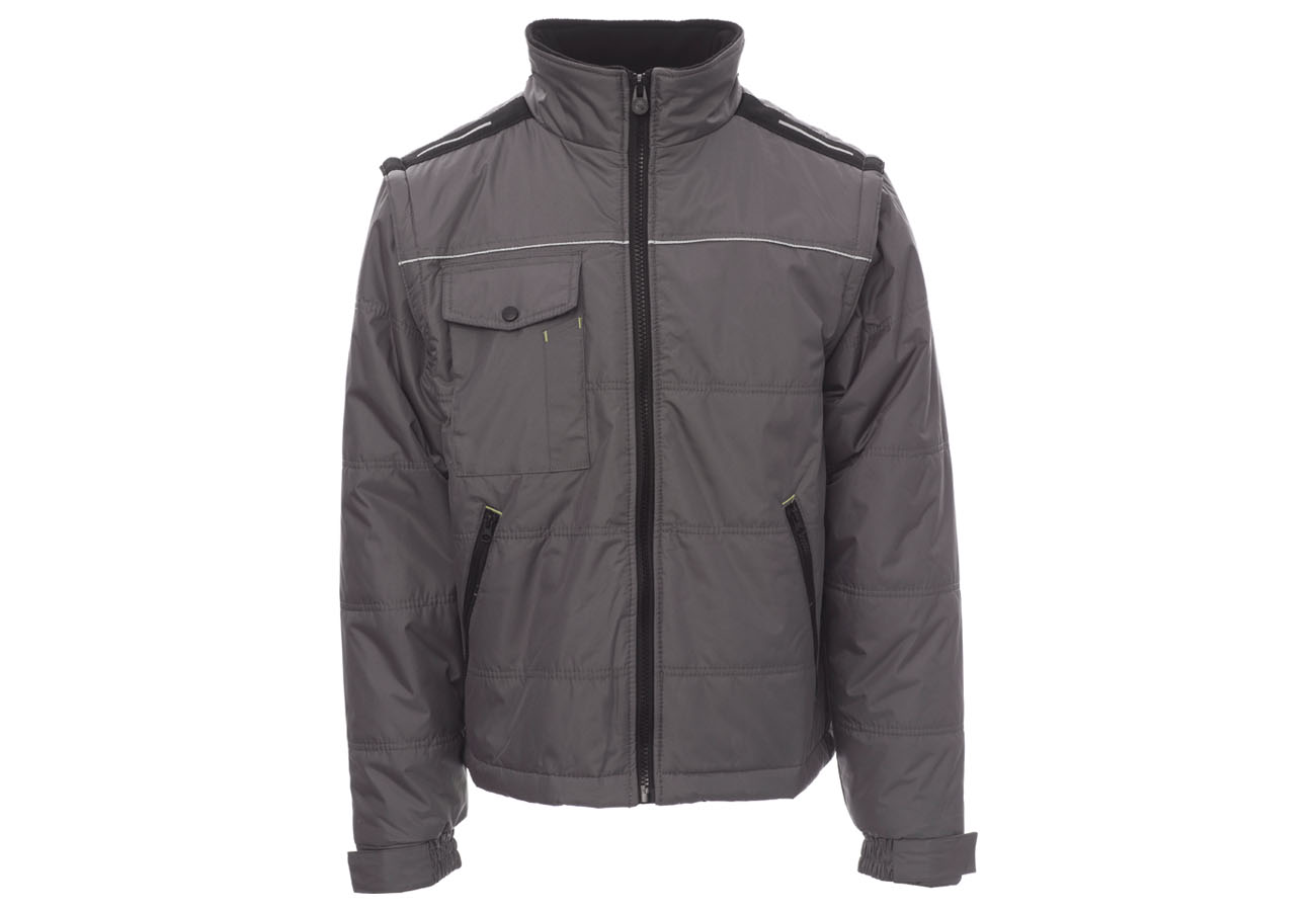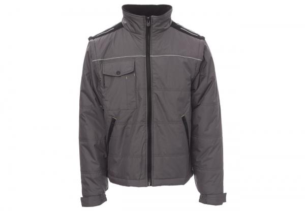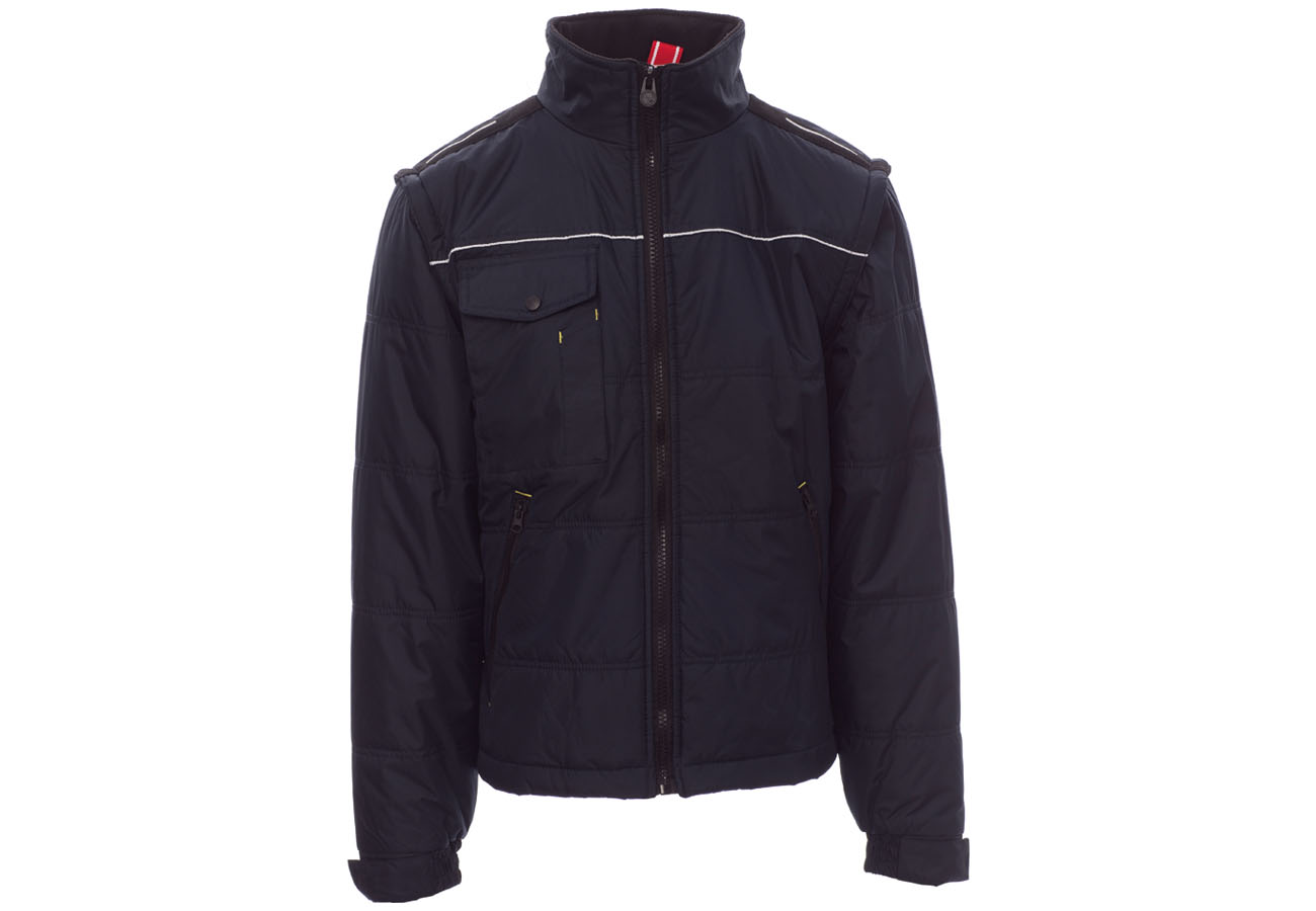 Giubbino da uomo, maniche staccabili, retro sagomato, zip 8mm in plastica con cursore in metallo, con cappuccio a scomparsa, due ampie tasche esterne con zip, ampia tasca al petto porta Smart-Phone, anello porta badge, piping reflex al petto e sulla schiena. Interno: imbottitura trapuntata e rifinita con fodera ad alta densità, interno colletto in pile, una tasca.