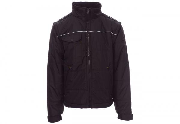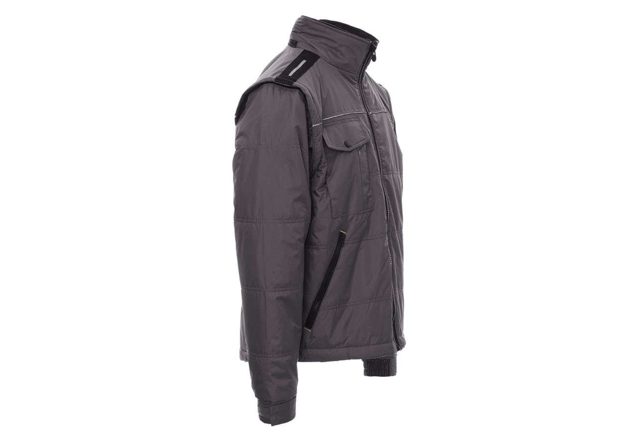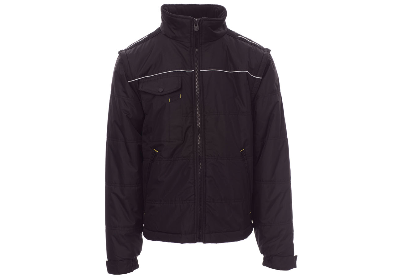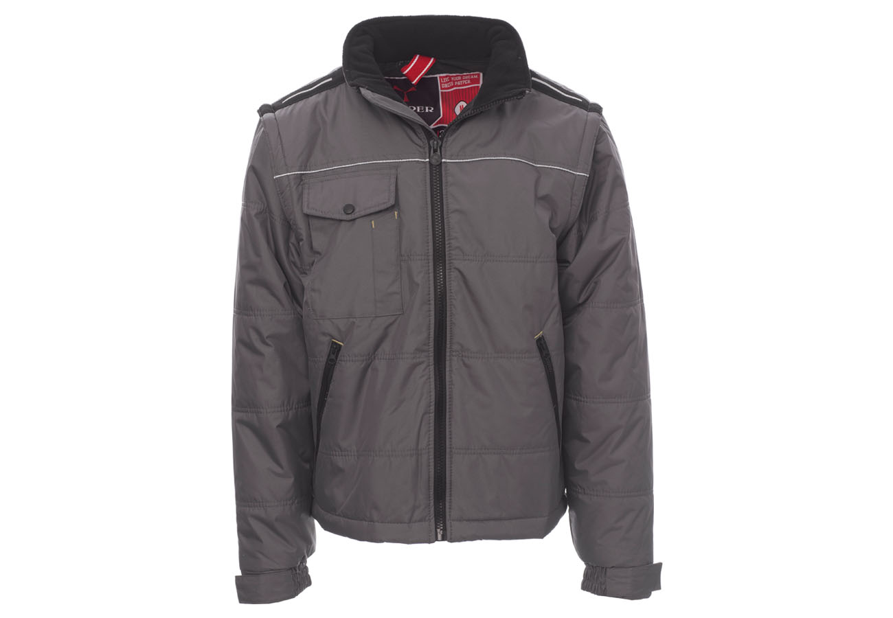 Giubbino da uomo, maniche staccabili, retro sagomato, zip 8mm in plastica con cursore in metallo, con cappuccio a scomparsa, due ampie tasche esterne con zip, ampia tasca al petto porta Smart-Phone, anello porta badge, piping reflex al petto e sulla schiena. Interno: imbottitura trapuntata e rifinita con fodera ad alta densità, interno colletto in pile, una tasca.