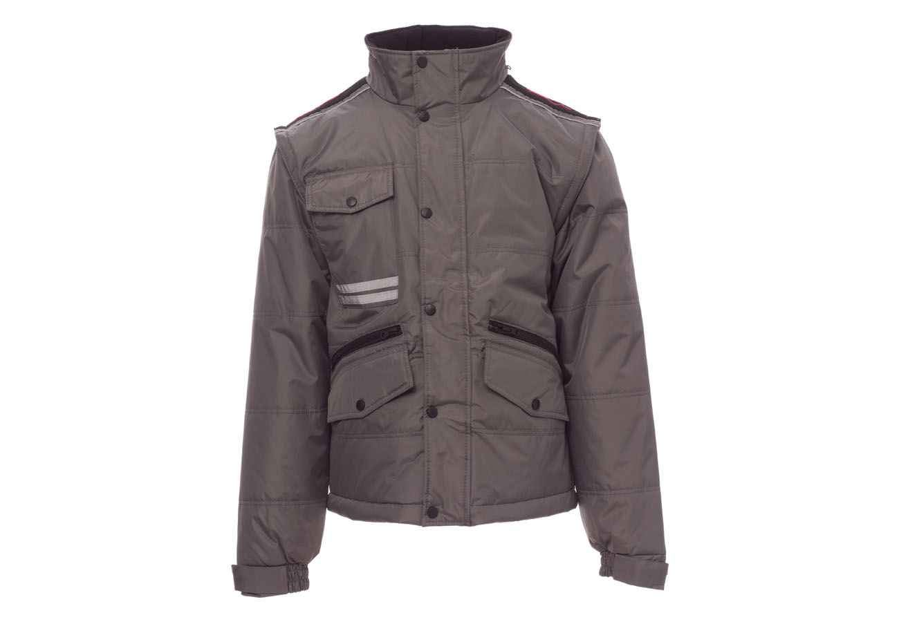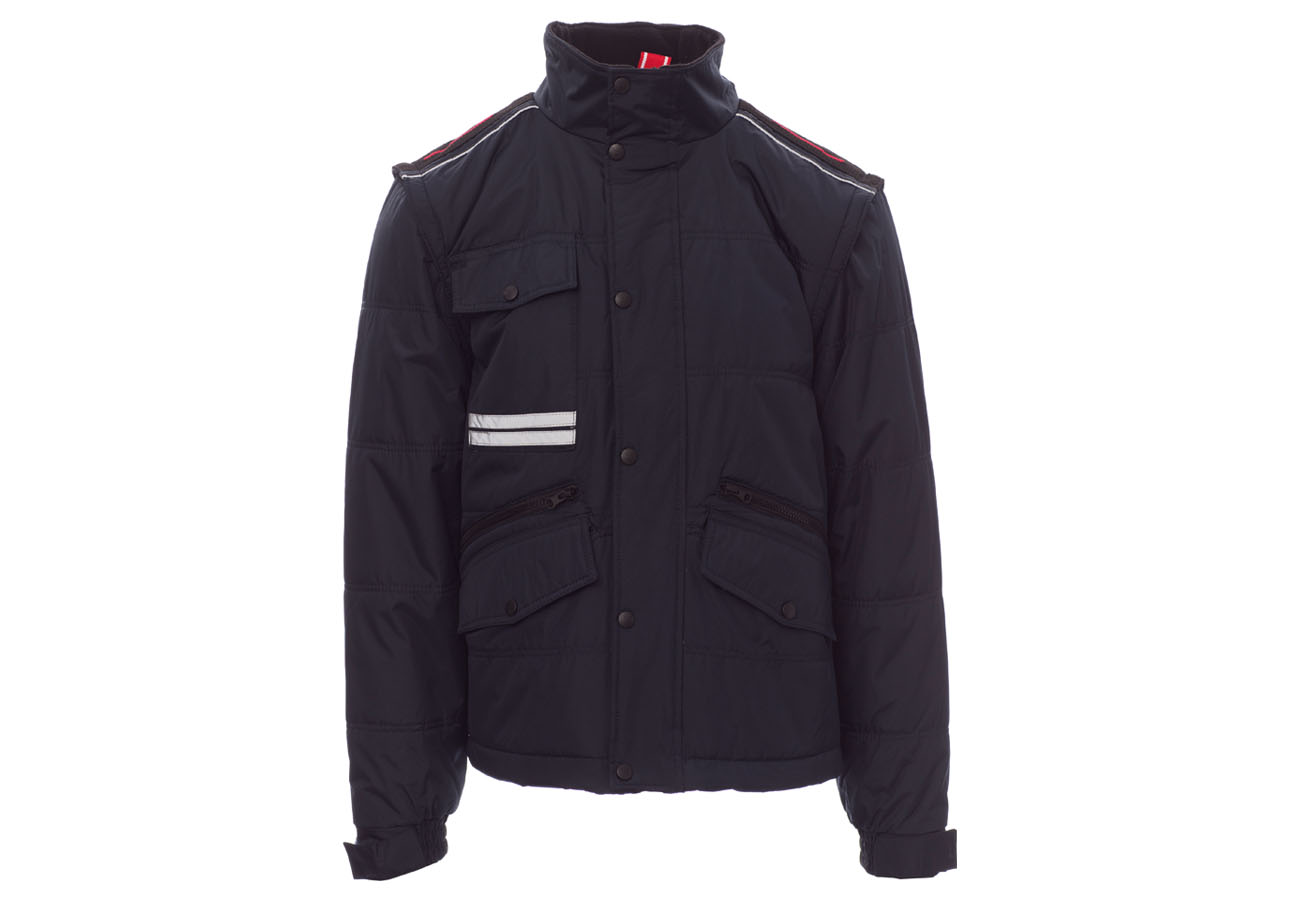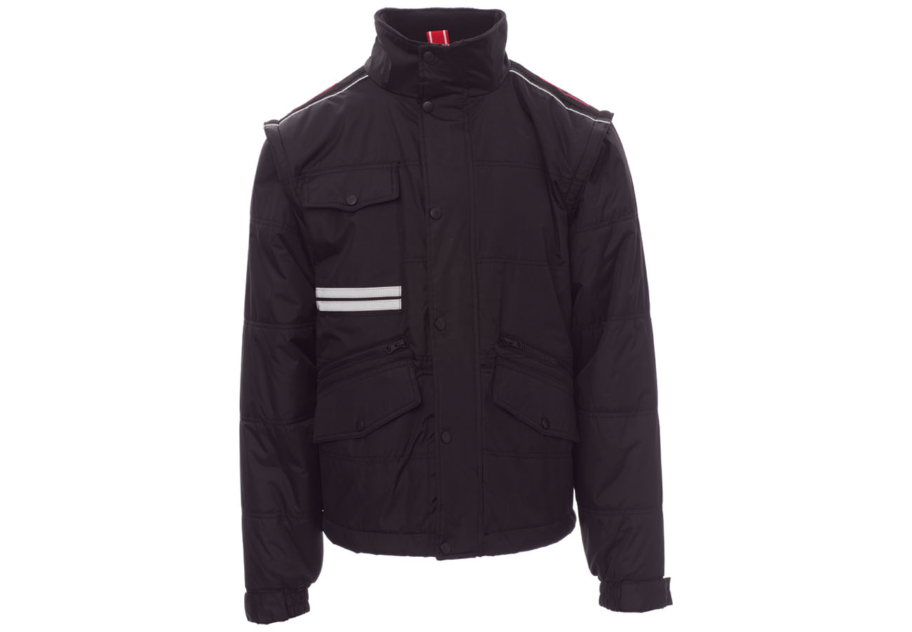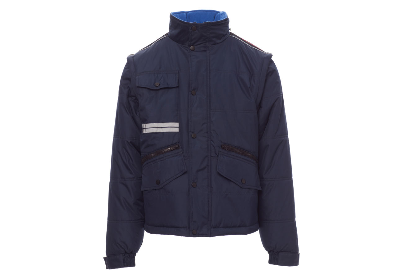 Giubbino da uomo, maniche staccabili, zip 8mm in plastica con cursore in metallo con patta e bottoni in plastica, retro sagomato e con cappuccio richiudibile nel colletto, due tasche esterne LOCK SYSTEM e due con zip, inclinazione delle tasche per agevolare l'ingresso della mano, una tasca al petto porta smart phone e anella porta badge, bande riflettenti sulla tasca e schiena. Interno: imbottito, pile in contrasto su schiena e collo , una tasca, zip interna per agevolare stampe e ricami.