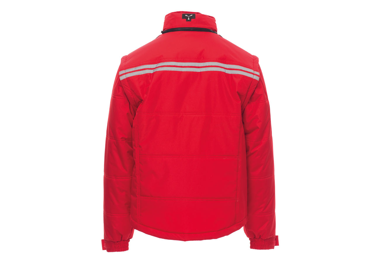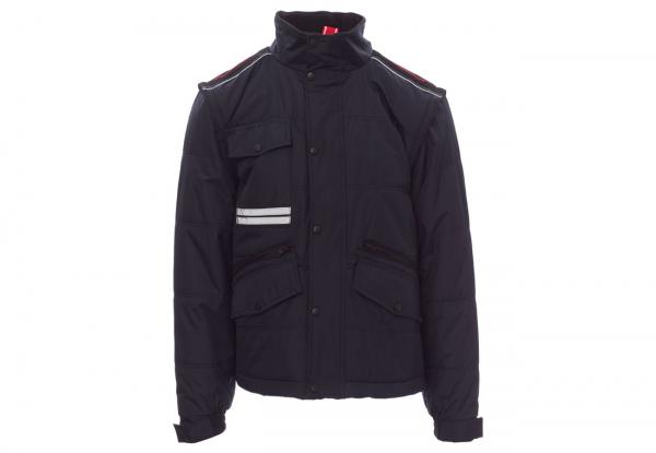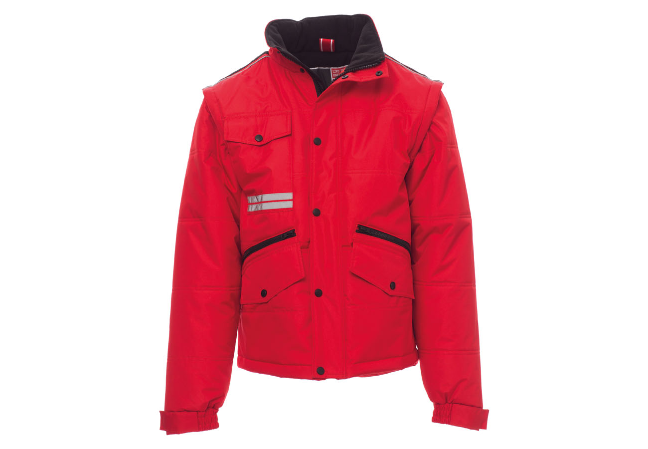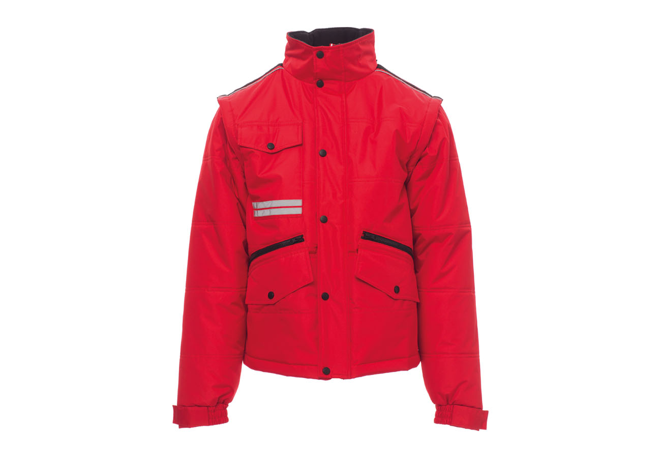 Giubbino da uomo, maniche staccabili, zip 8mm in plastica con cursore in metallo con patta e bottoni in plastica, retro sagomato e con cappuccio richiudibile nel colletto, due tasche esterne LOCK SYSTEM e due con zip, inclinazione delle tasche per agevolare l'ingresso della mano, una tasca al petto porta smart phone e anella porta badge, bande riflettenti sulla tasca e schiena. Interno: imbottito, pile in contrasto su schiena e collo , una tasca, zip interna per agevolare stampe e ricami.
