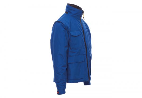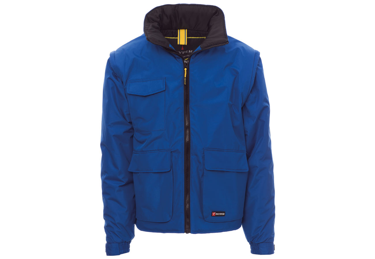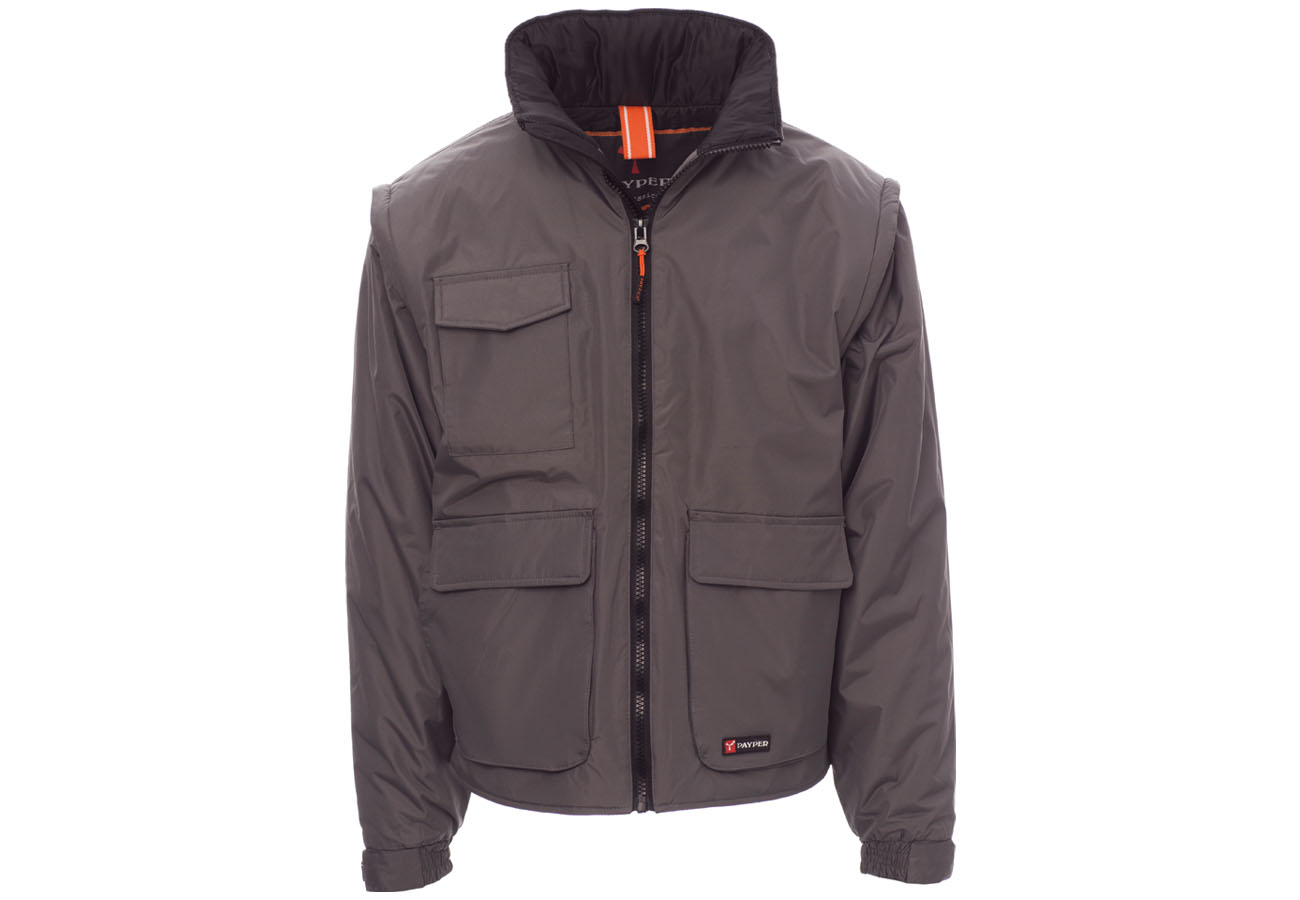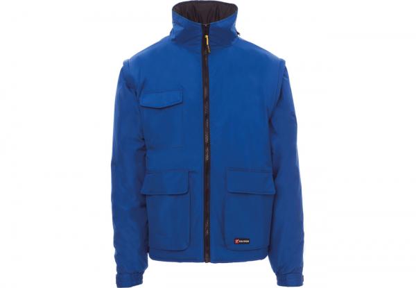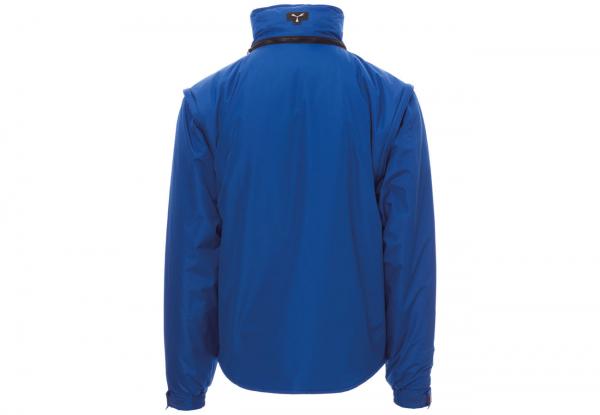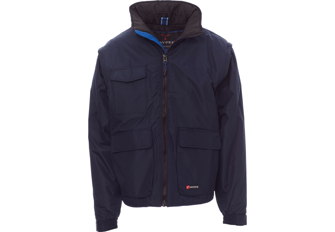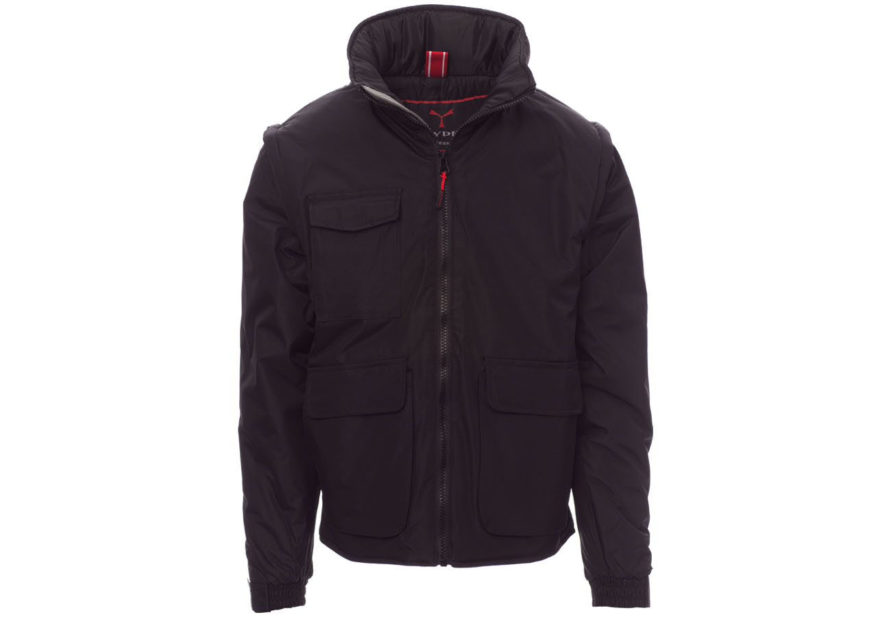 Giubbino da uomo, maniche staccabili, zip 8mm in plastica con cursore in metallo, cappuccio richiudibile nel colletto, elastico e stringi polsi, due ampie tasche frontali LOCK-SYSTEM, due tasche laterali, porta cellulare al petto. Interno: imbottito, zip per agevolare stampe e ricami.
