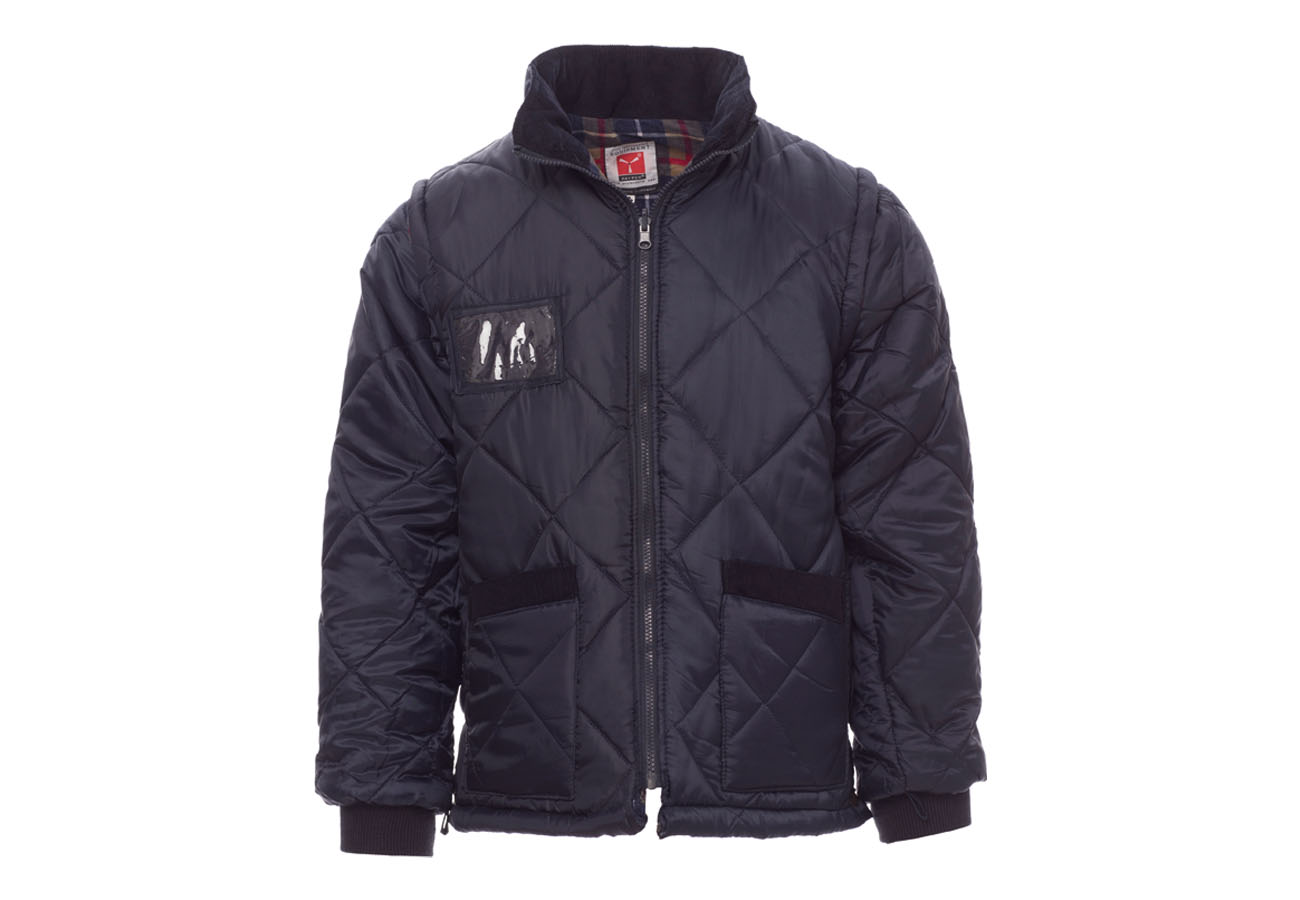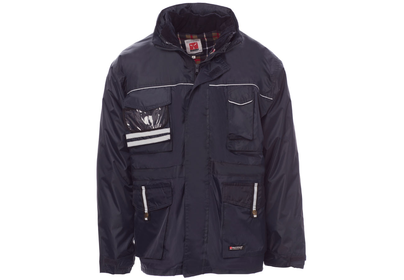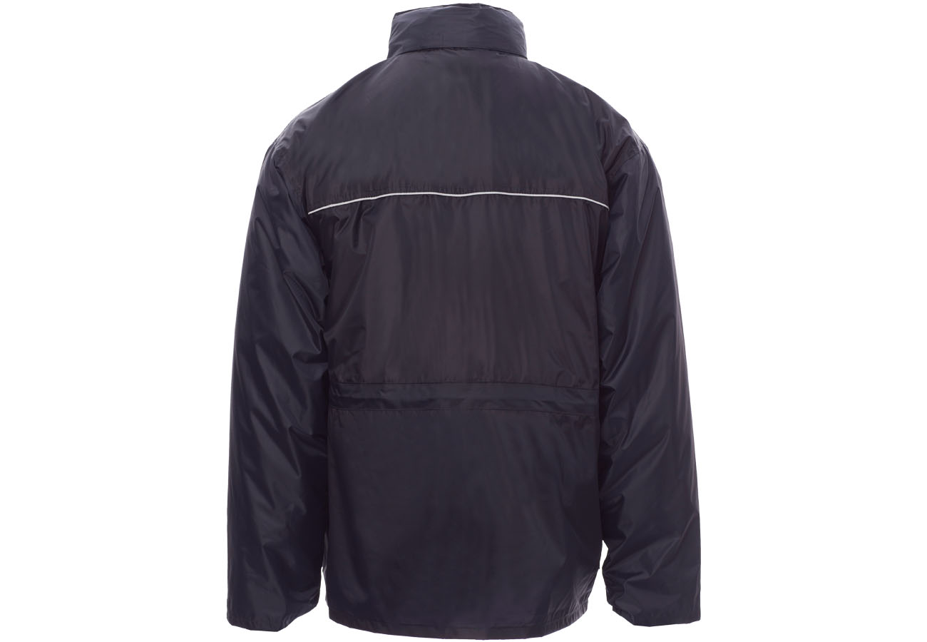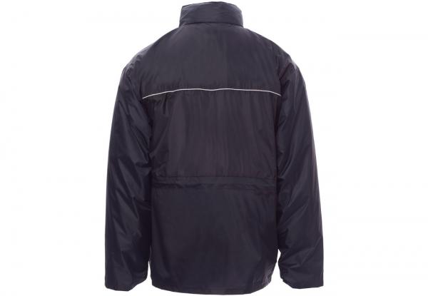 Parka triplo uso composta da: giacca esterna non imbottita, con inserti reflex fronte e retro, cappuccio richiudibile nel colletto, quattro tasche di cui una portabadge reversibile e un portacellulare. Giacca interna staccabile in husky trapuntato con due tasche, maniche staccabili, interno foderato in tessuto di scozia.