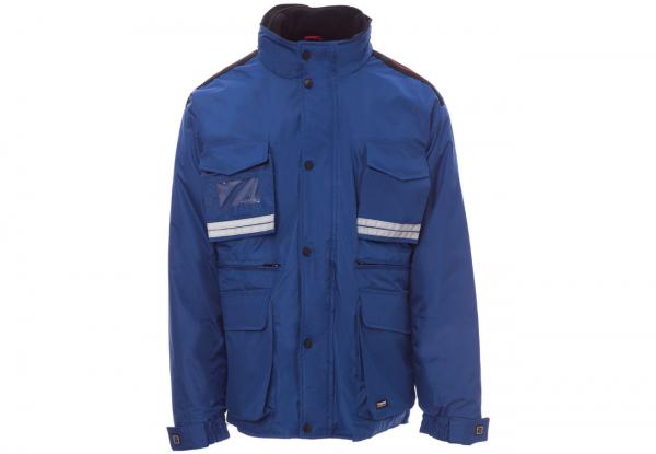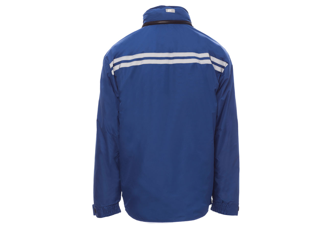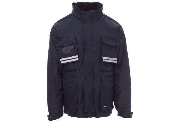Parka quattro usi composto da: giacca esterna non imbottita, foderata in nylon, con colletto, schiena e scaldareni in micropile e inserti traspiranti sottobraccio, zip 8mm in plastica con cursore in metallo con patta e bottoni in plastica, cappuccio sagomato staccabile e/o richiudibile nel colletto, polsini regolabili, bande riflettenti grigie fronte e retro, gomiti preformanti e spacchetto laterale con soffietto e zip, nove tasche esterne di cui due LOCK SYSTEM, due con zip e interno rinforzato, una con portabadge reversibile, coulisse in vita e zip interna per agevolare stampe e ricami. Giubbotto interno, maniche staccabili, imbottito, fodera altà densità e schiena in micropile, cappuccio richiudibile nel colletto, cinque tasche, di cui una con protabadge reversibile, chiusura al collo, piping reflex alle spalle e doppia fascia reflex sulla tasca al petto e sulla schiena, interno collo in rib, una tasca interna.