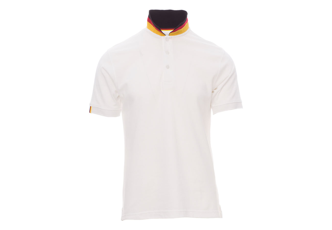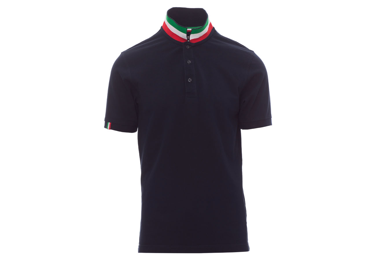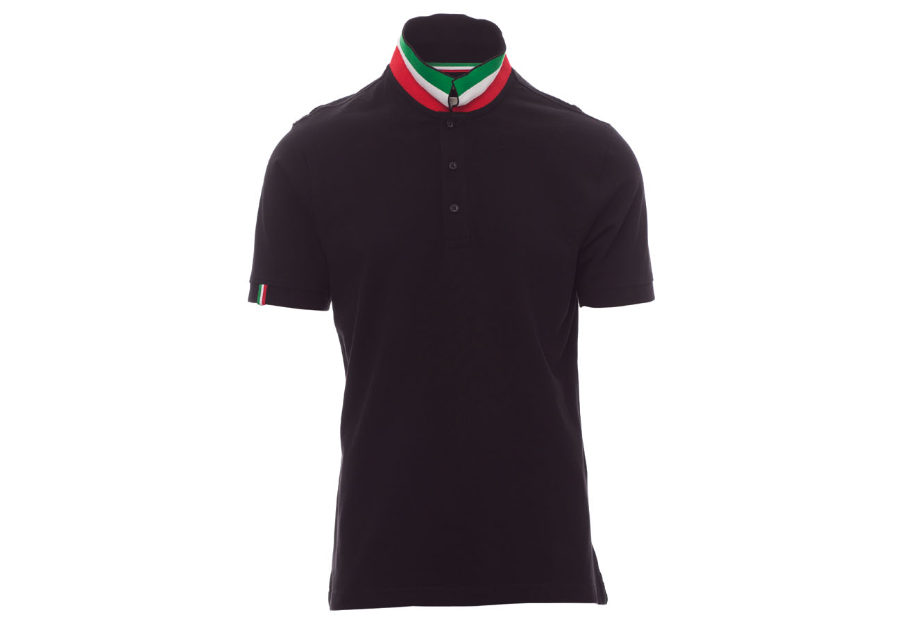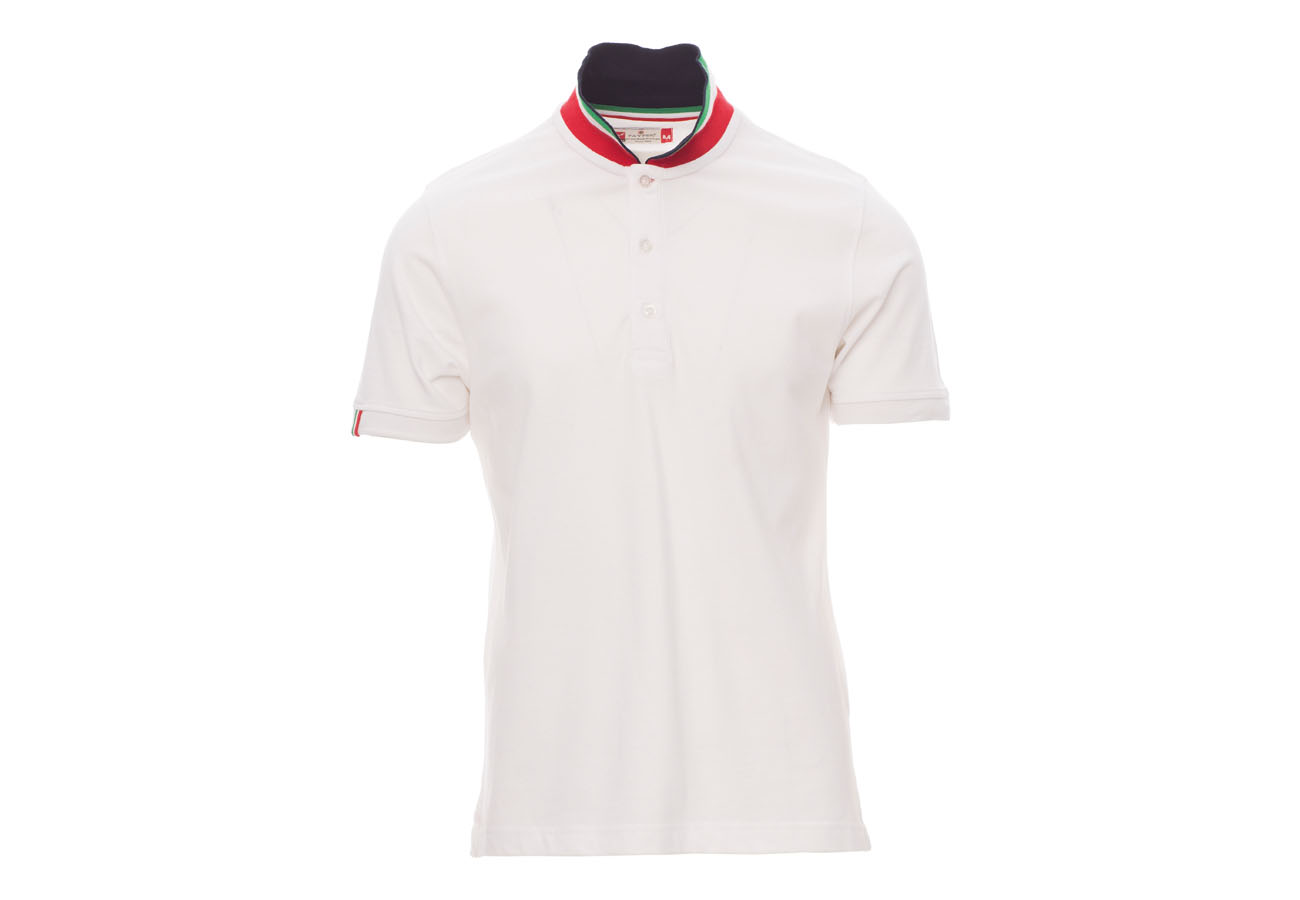 Polo da uomo manica corta a tre bottoni in tinta ad effetto perlato, colletto da un lato in tinta, dall'altro lato a contrasto con colori bandiera visibile solo se alzato, bordo manica dx con fine inserto colore bandiera in contrasto, colletto e bordo manica a costine, spacchetti laterali con colore bandiera, cuciture del collo coperte con nastro in jersey colori bandiera, nastro di rinforzo laterale, rinforzo sagomato retrocollo.