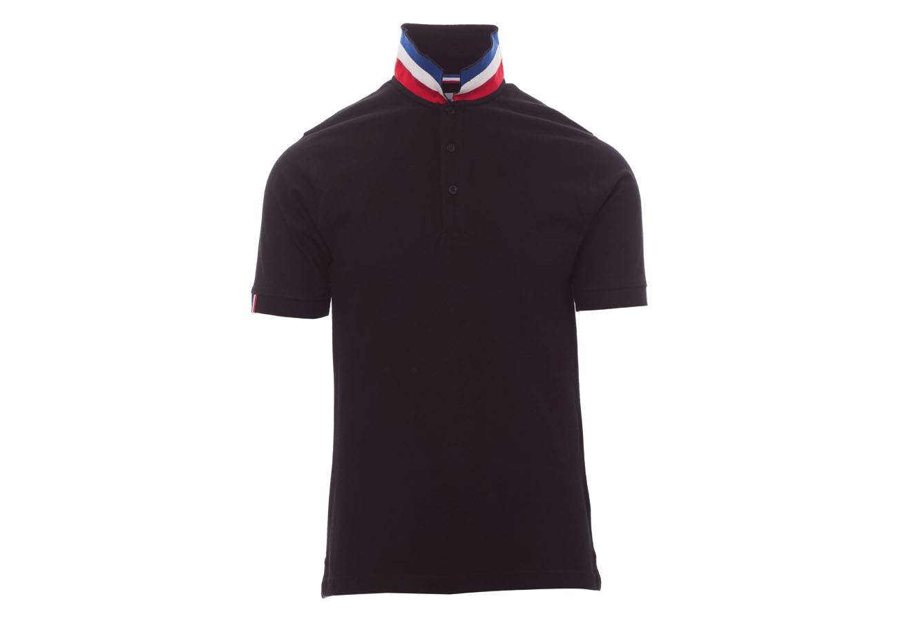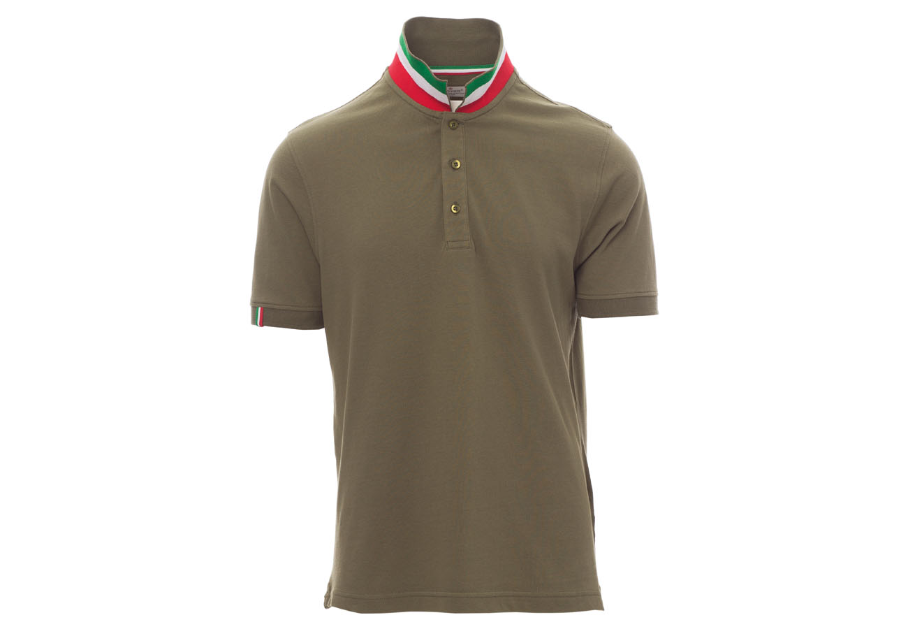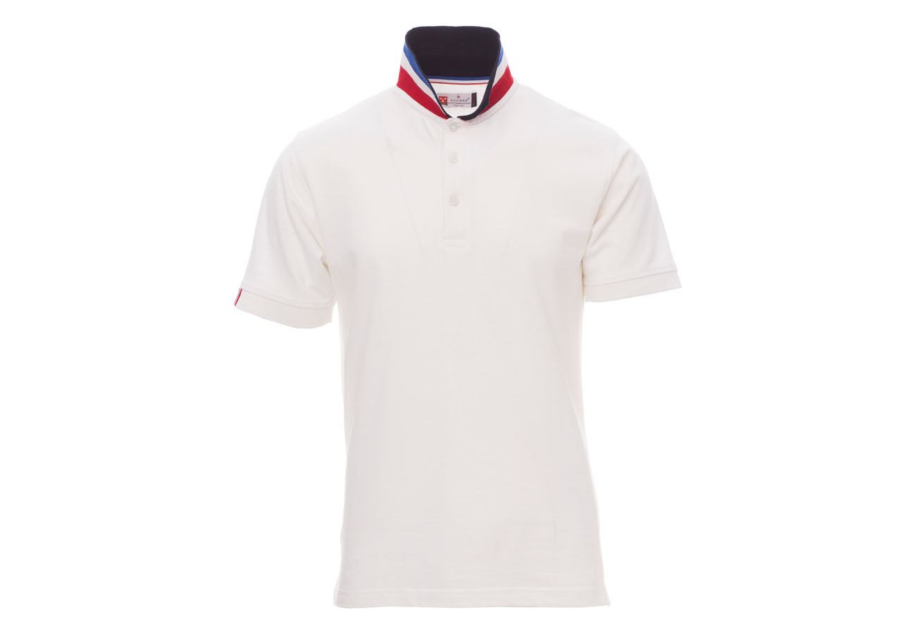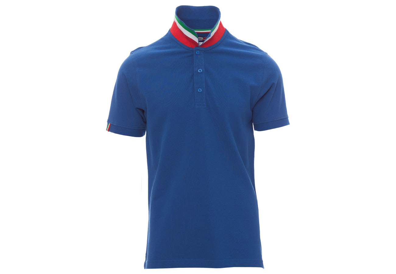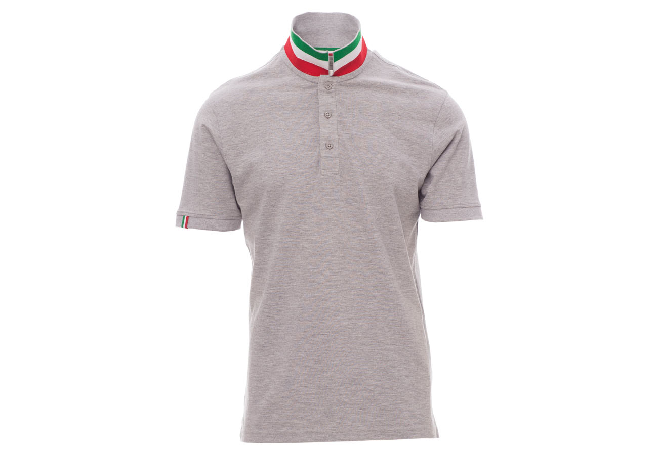 Polo da uomo manica corta a tre bottoni in tinta ad effetto perlato, colletto da un lato in tinta, dall'altro lato a contrasto con colori bandiera visibile solo se alzato, bordo manica dx con fine inserto colore bandiera in contrasto, colletto e bordo manica a costine, spacchetti laterali con colore bandiera, cuciture del collo coperte con nastro in jersey colori bandiera, nastro di rinforzo laterale, rinforzo sagomato retrocollo.