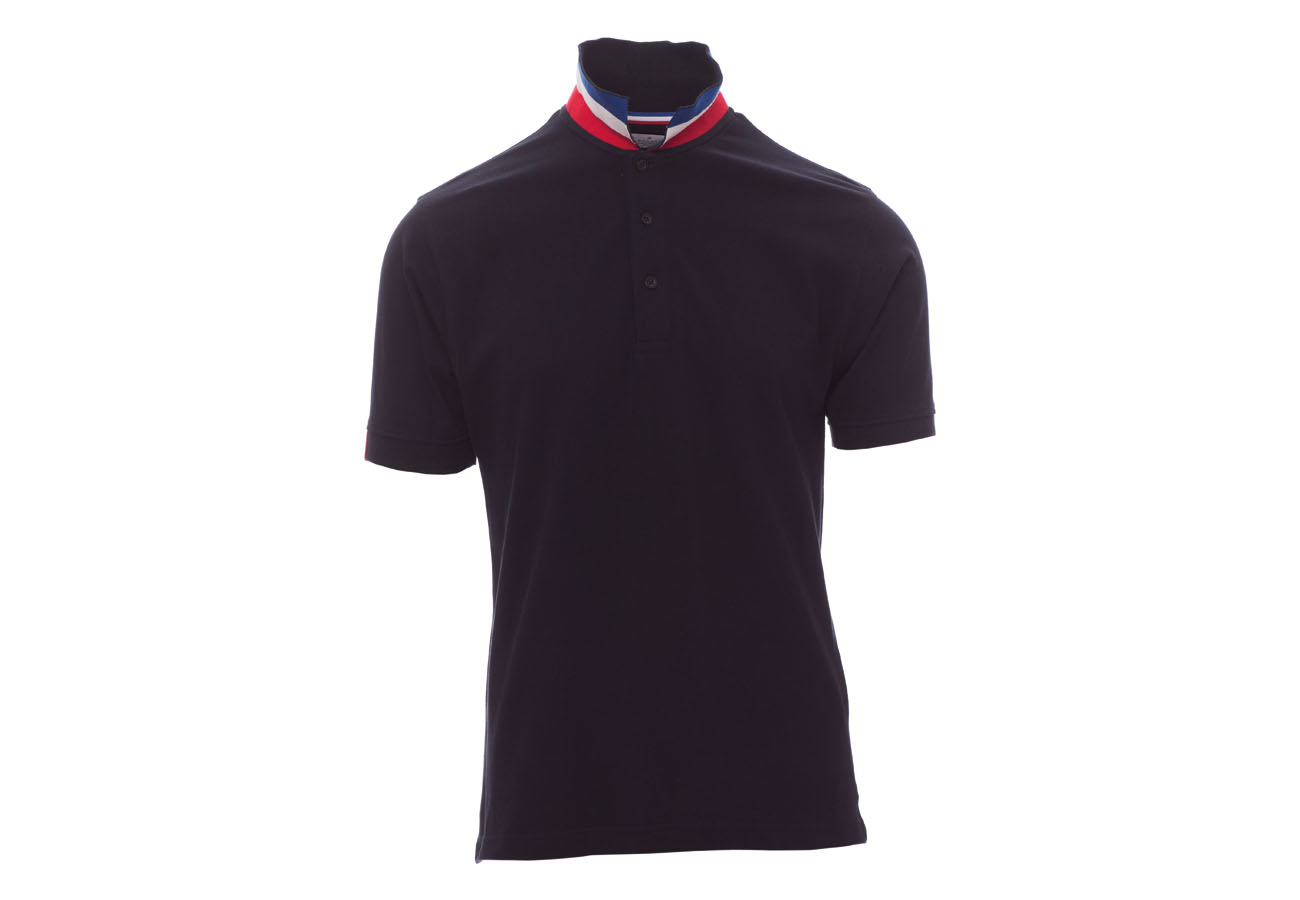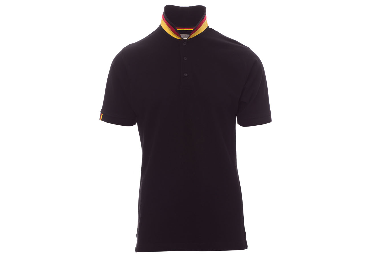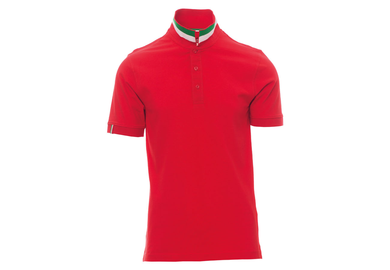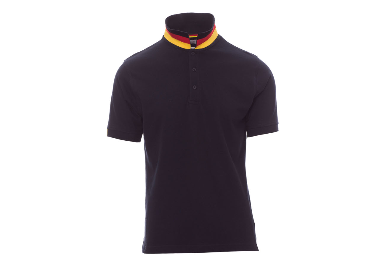 Polo da uomo manica corta a tre bottoni in tinta ad effetto perlato, colletto da un lato in tinta, dall'altro lato a contrasto con colori bandiera visibile solo se alzato, bordo manica dx con fine inserto colore bandiera in contrasto, colletto e bordo manica a costine, spacchetti laterali con colore bandiera, cuciture del collo coperte con nastro in jersey colori bandiera, nastro di rinforzo laterale, rinforzo sagomato retrocollo.
