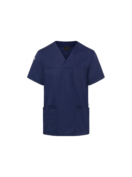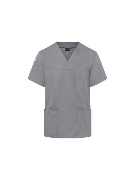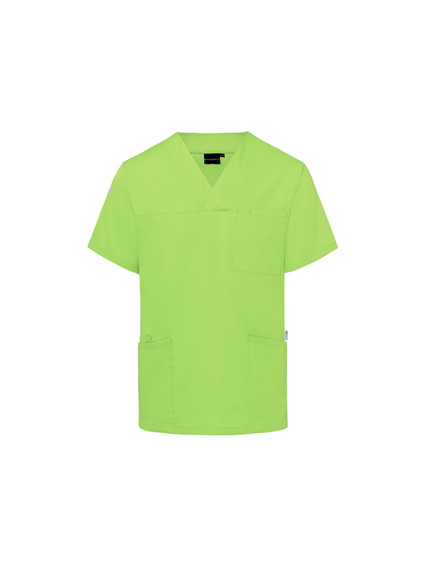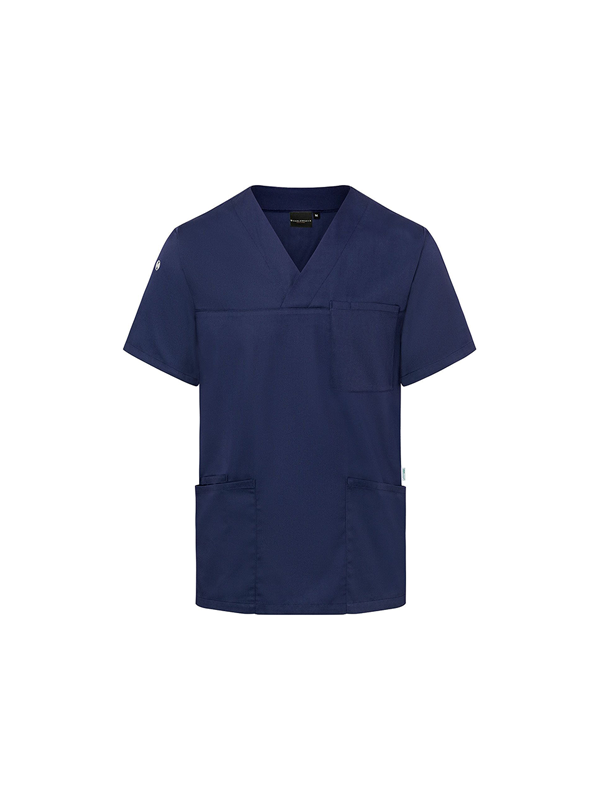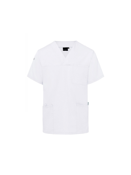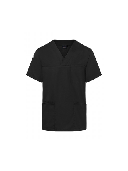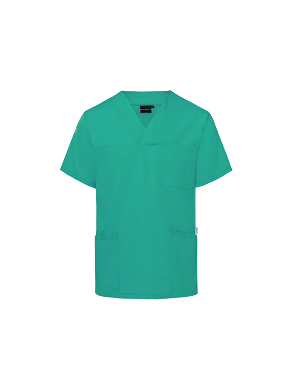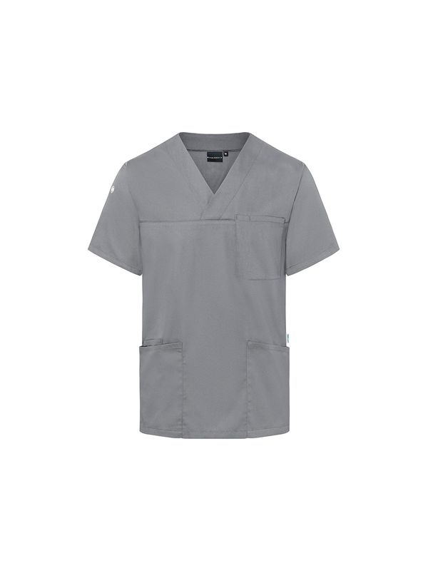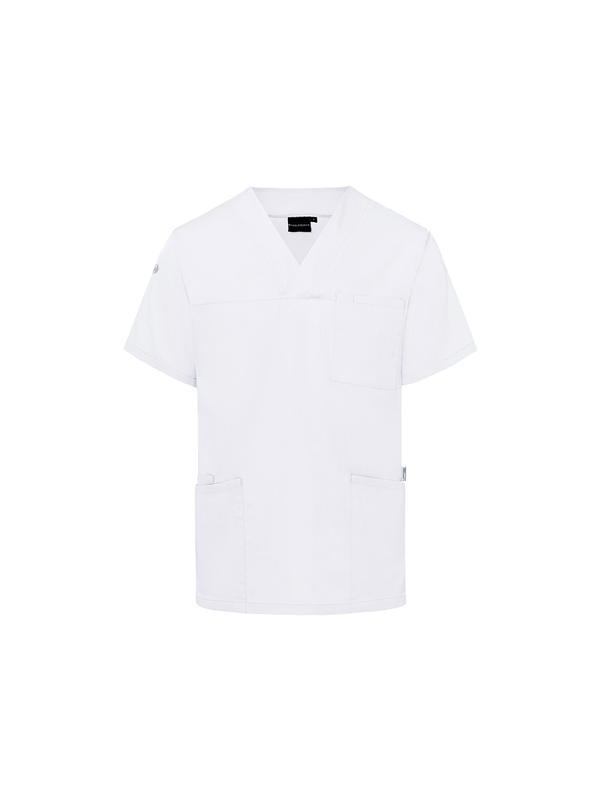 Camice da uomo facile da indossare e sostenibile, collo a V e maniche corte, taglio regular, altissima lavabilità per garantire purezza clinica. 2 tasche laterali con tasca interna nascosta a destra, 1 passante portachiavi nella tasca laterale, tasca sul petto a sinistra con tasca portapenne.