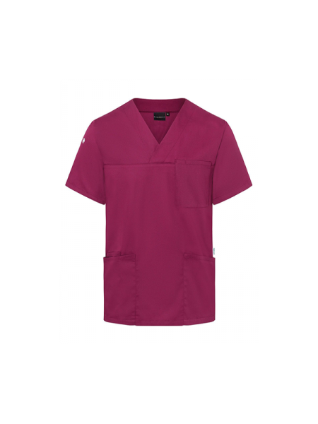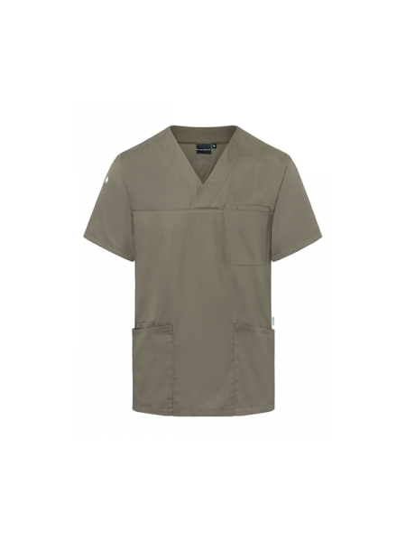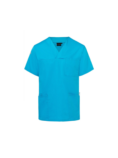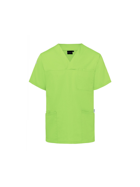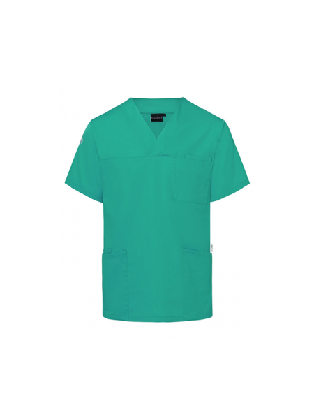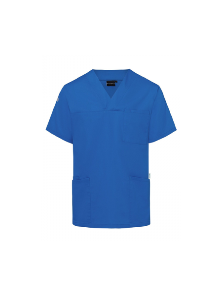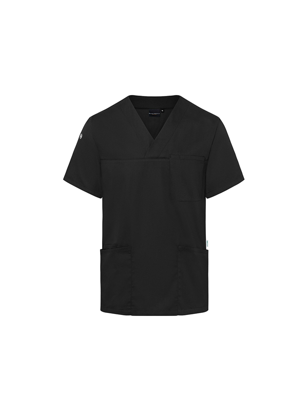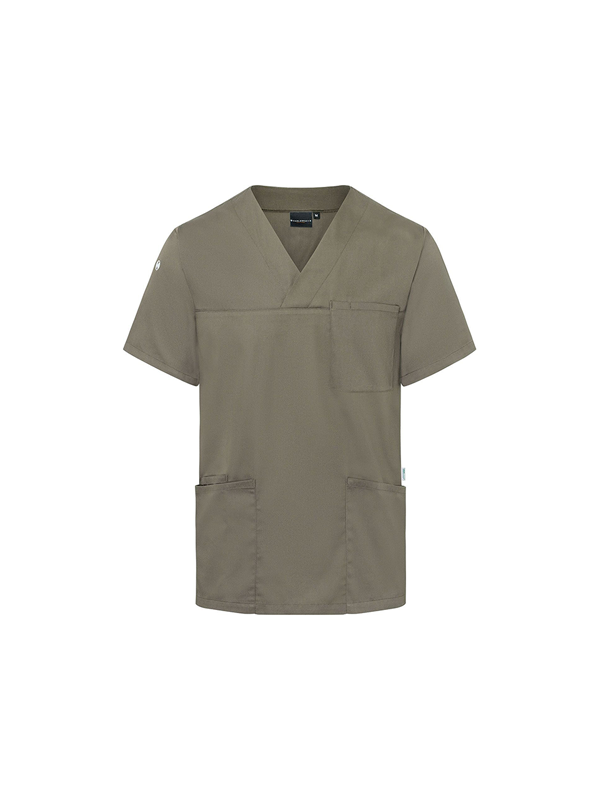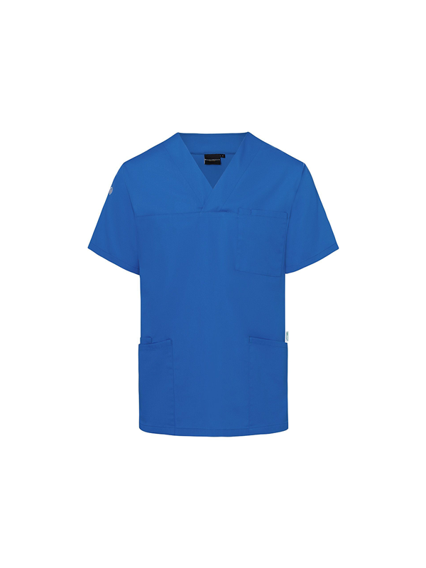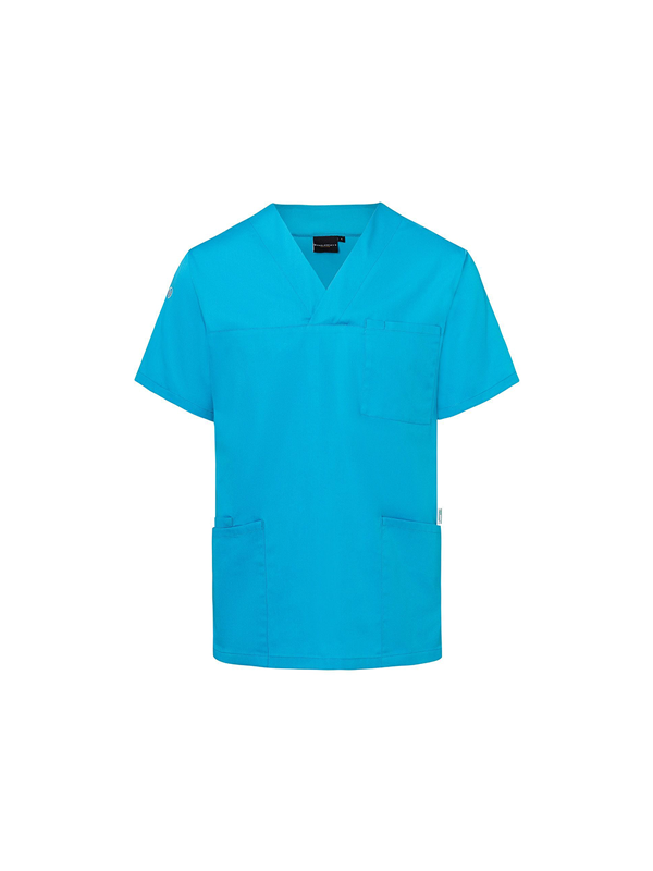 Camice da uomo facile da indossare e sostenibile, collo a V e maniche corte, taglio regular, altissima lavabilità per garantire purezza clinica. 2 tasche laterali con tasca interna nascosta a destra, 1 passante portachiavi nella tasca laterale, tasca sul petto a sinistra con tasca portapenne.